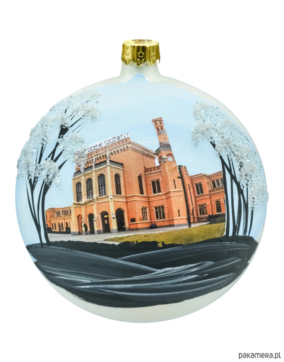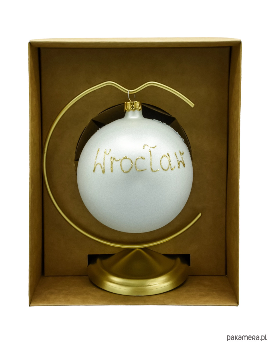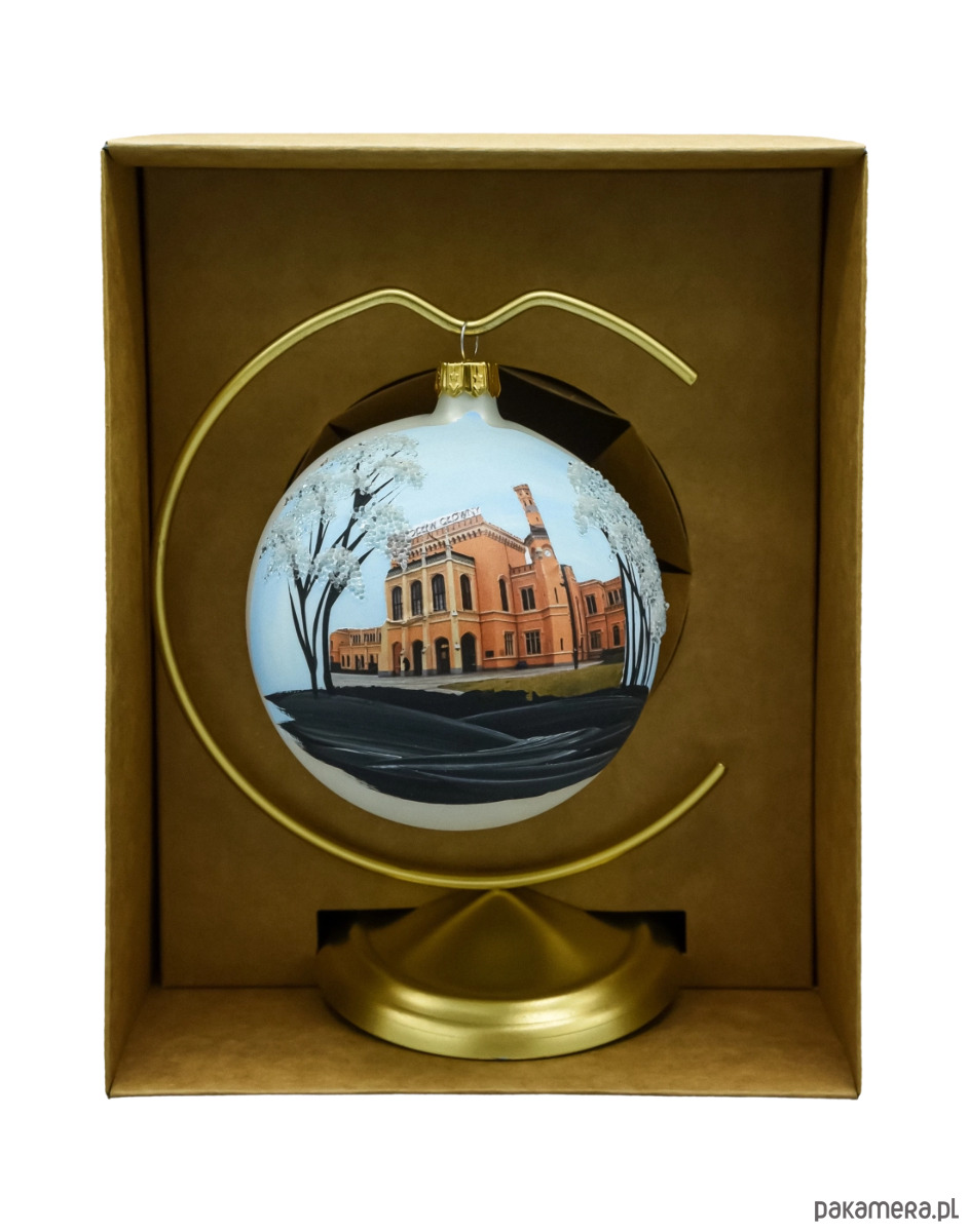 Wytworna, ręcznie malowana bombka choinkowa przedstawiająca Wrocław – z realistycznym widokiem Dworca Głównego w otoczeniu zimowego pejzażu. Kula o średnicy 10 cm została wydmuchana ustnie ze szkła i zdobiona warstwowo farbami oraz połyskującym brokatem. Na rewersie widnieje napis „Wrocław”. Całość uzupełnia stabilny, metalowy stojak w kolorze złota, dzięki któremu bombka może zdobić nie tylko choinkę, ale także komodę, biurko, ladę recepcyjną czy witrynę przez cały rok. To perfekcyjny prezent z Wrocławia, elegancka pamiątka turystyczna i oryginalna ozdoba świąteczna premium do domu, hotelu, restauracji czy biura.