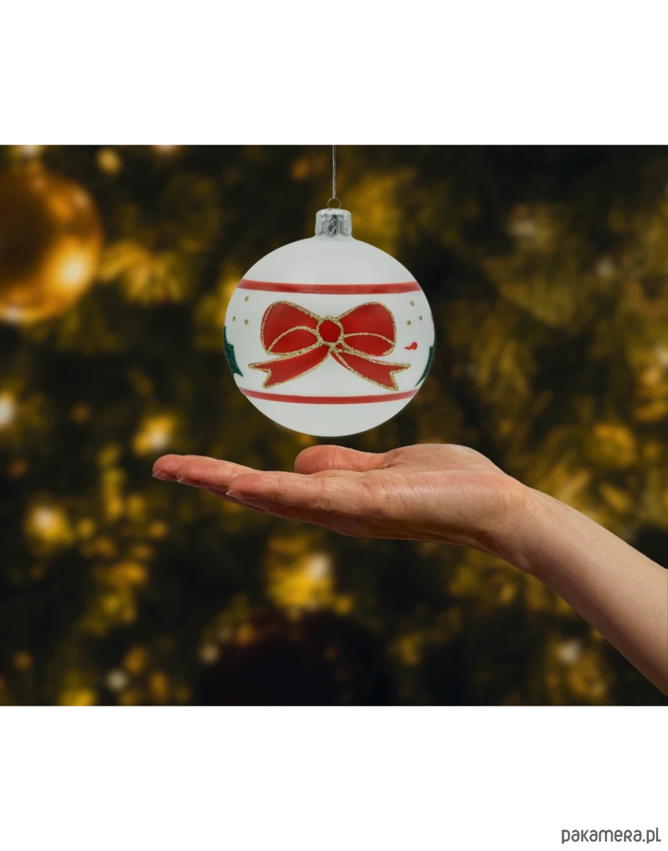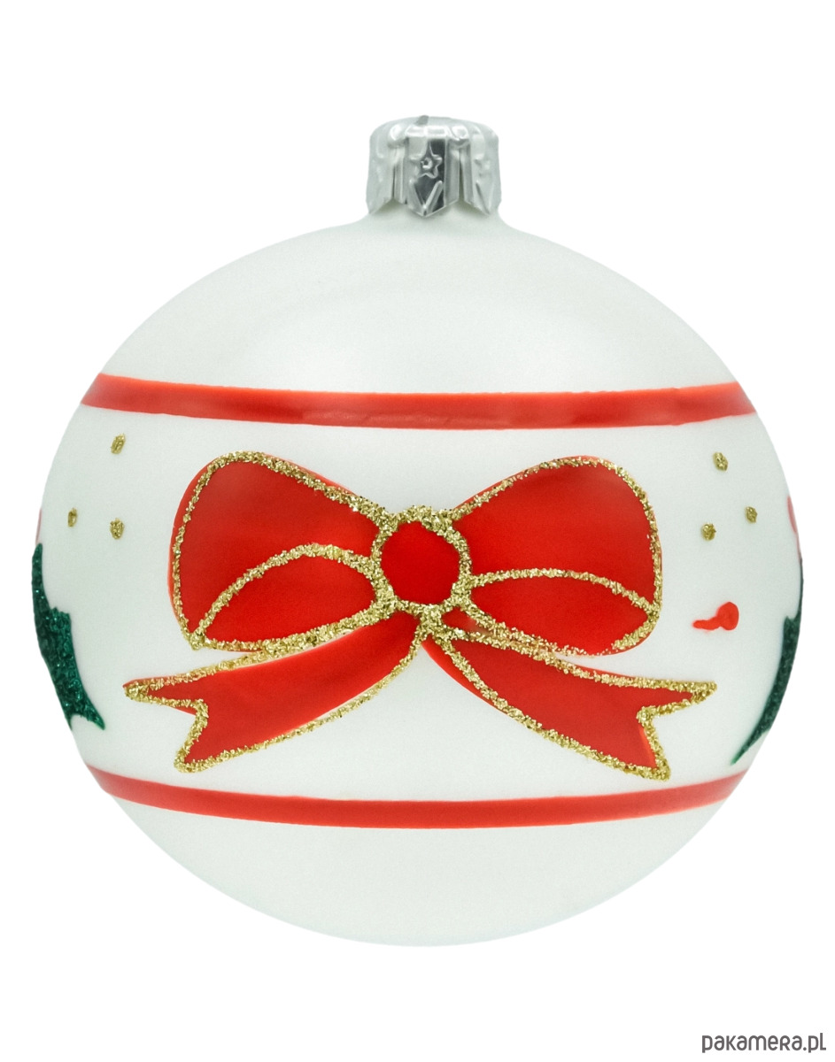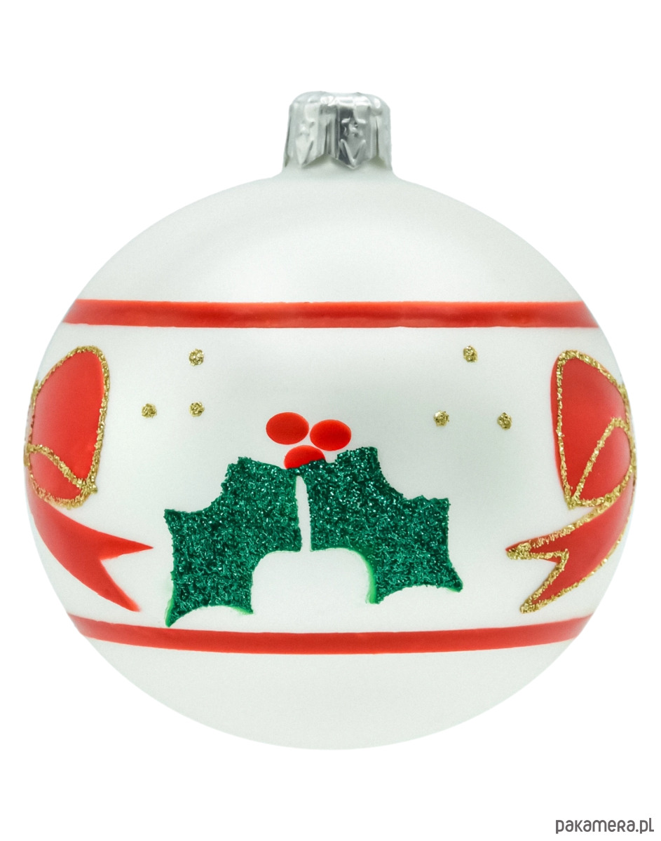 Klasyczna bombka szklana 8 cm w eleganckiej, świątecznej odsłonie. Na matowym, śnieżnobiałym tle ręcznie namalowano czerwone wstęgi i kokardę, a centralnym motywem jest zielony ostrokrzew wysypany połyskującym brokatem. Drobne, złote kropki dodają blasku i sprawiają, że ozdoba pięknie mieni się w świetle choinkowych lampek. To dekoracja, która łączy tradycję z nutą glamour – idealna do stylu klasycznego, retro oraz nowoczesnego.