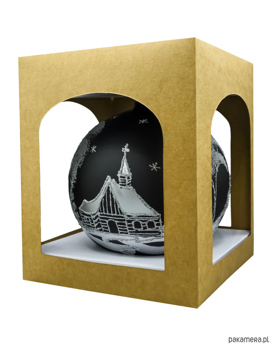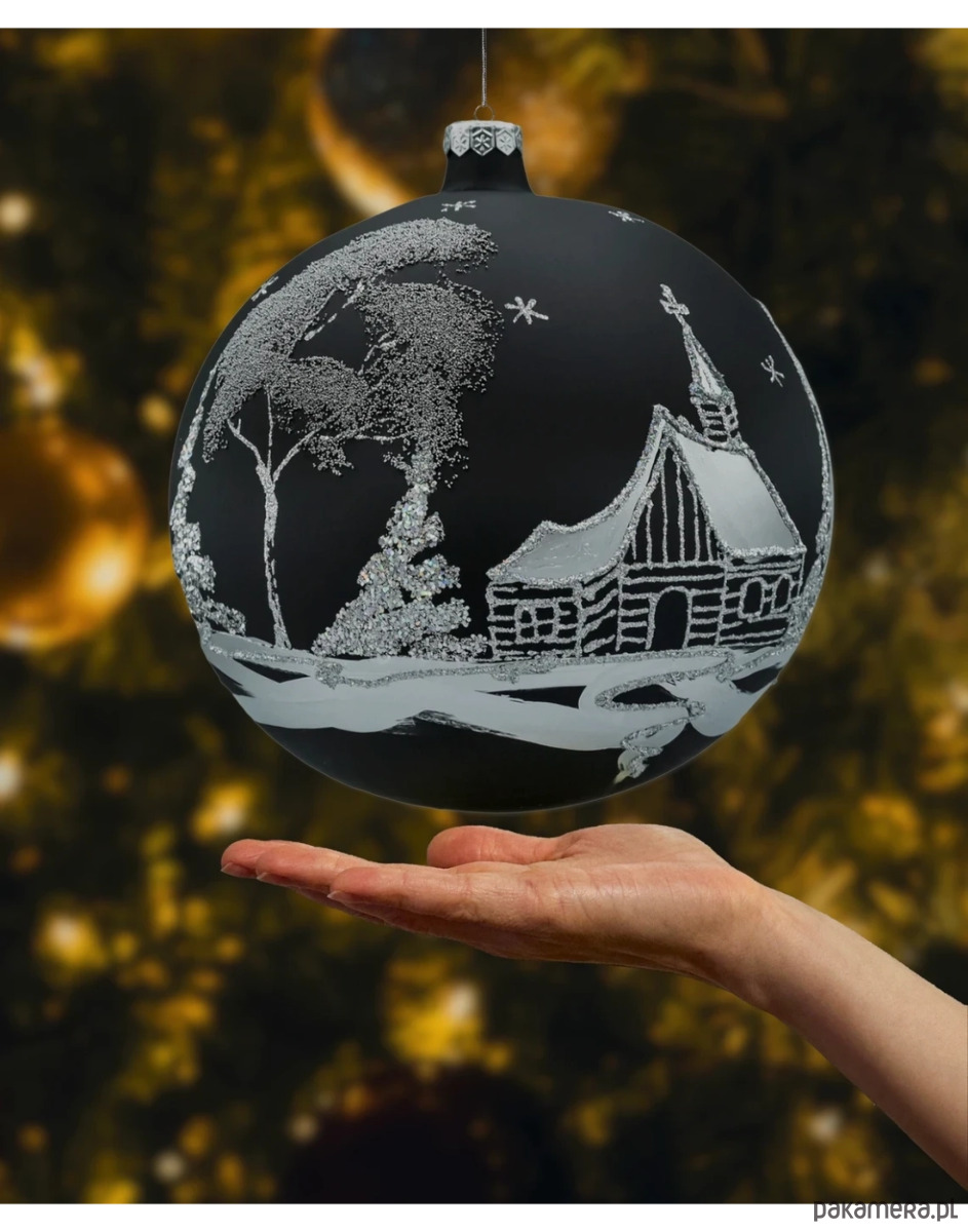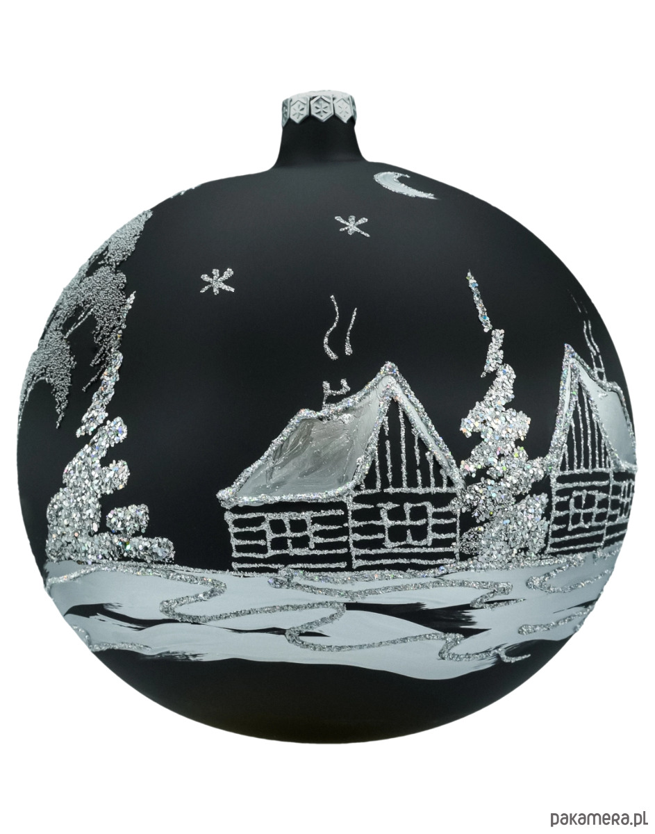 Wyjątkowo elegancka bombka choinkowa 20 cm w głębokim, czarnym macie. Na kuli artysta namalował zimowy pejzaż: drewniane chaty i kościółek, świerki oraz księżyc i gwiazdy. Zdobienia wykonano srebrną farbą i drobnym brokatem (w tym efekt holograficzny), który tworzy delikatne reliefy 3D i pięknie mieni się w świetle lampek. Kontrastowe połączenie black & silver nadaje ozdobie nowoczesny, glamour’owy charakter, a jednocześnie zachowuje urok klasycznej sceny zimowej.