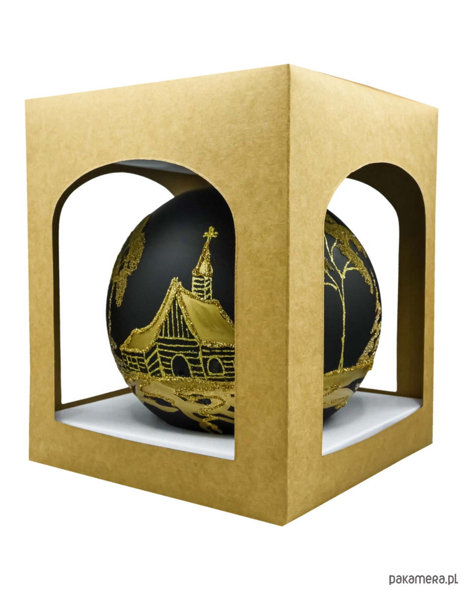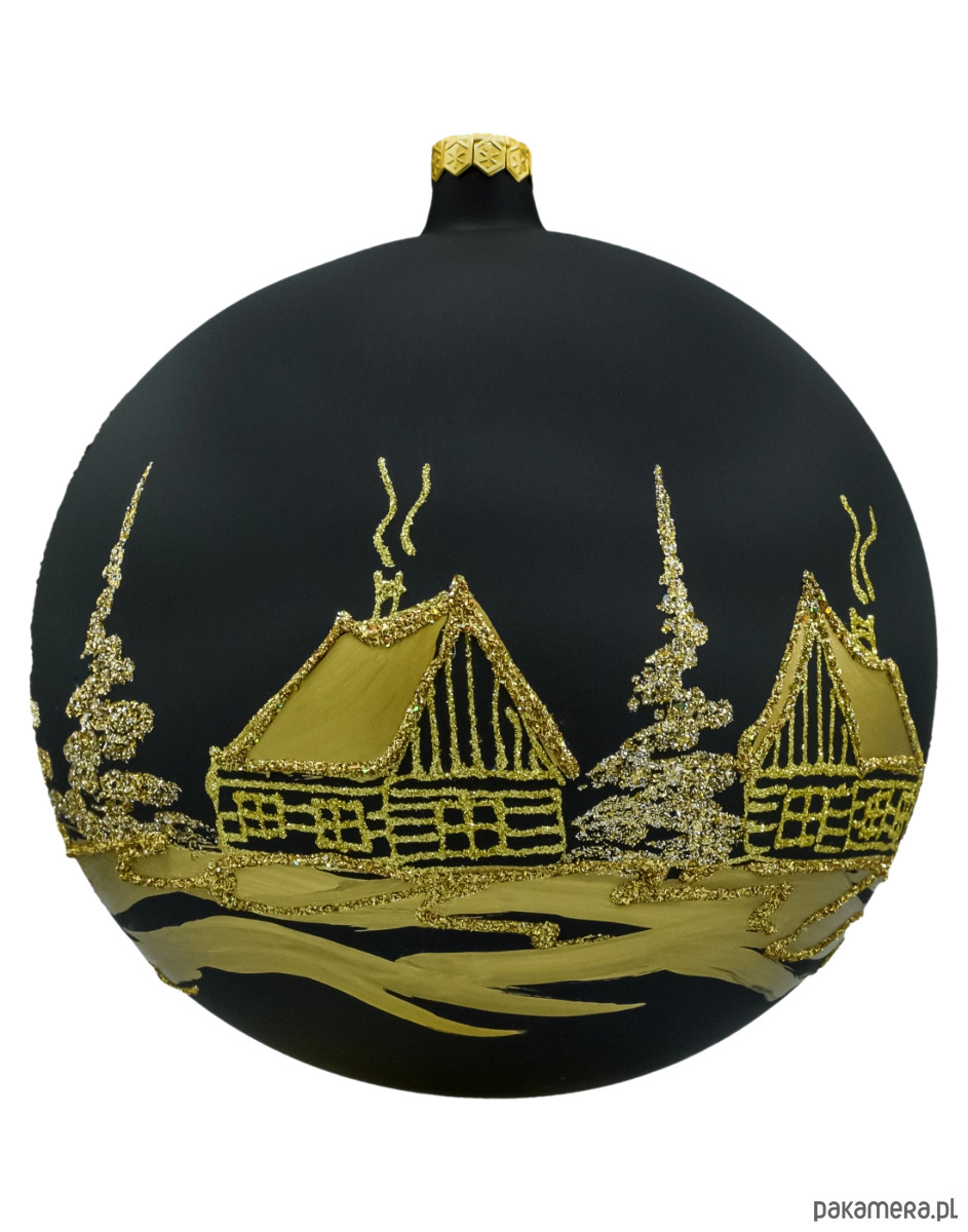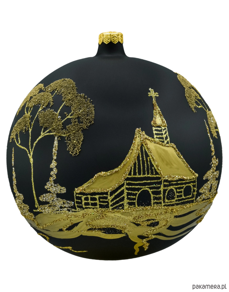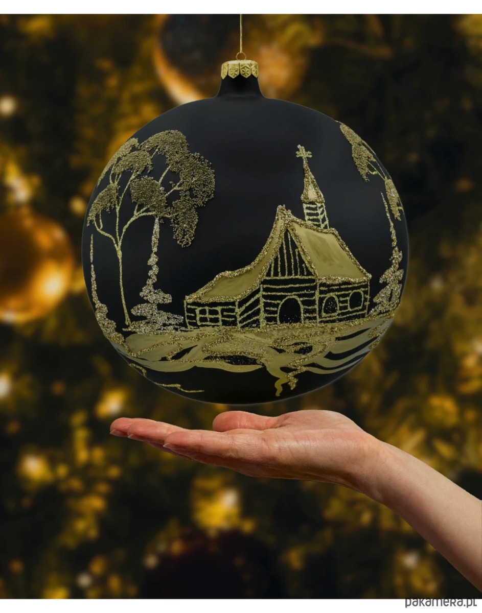 Wyjątkowa, duża bombka choinkowa 20 cm wykonana ze szkła i ręcznie malowana. Matowa czerń stanowi eleganckie tło dla złotego, brokatowego pejzażu zimowej wioski z kościółkiem i chatami. Dekor ma delikatny efekt 3D, pięknie łapie światło lampek, nadając choince i aranżacjom glamour i świątecznego blasku. To dekoracja klasy premium, która sprawdzi się zarówno w domu, jak i w przestrzeniach reprezentacyjnych.