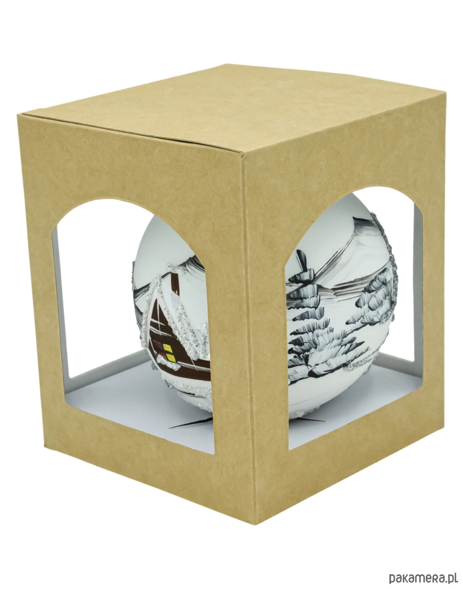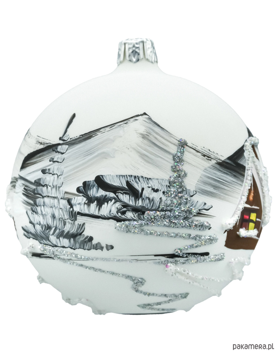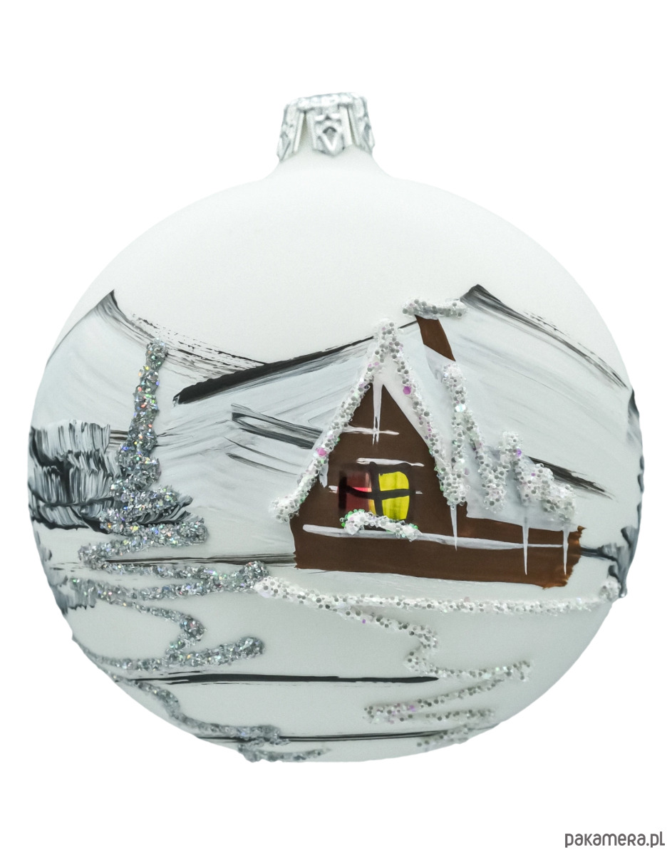 Wyjątkowa szklana bombka choinkowa z malowanym dookoła zimowym pejzażem. Na matowym, śnieżnobiałym tle artysta odtworzył drewniany domek z ośnieżonym dachem, migoczące zaspy i choinki podkreślone delikatnym srebnym brokatem. Subtelna, monochromatyczna paleta bieli, szarości i brązów sprawia, że ozdoba wygląda elegancko i ponadczasowo – pasuje zarówno do klasycznej zielonej choinki, jak i aranżacji w stylu skandynawskim czy glamour. Bombka jest lekka, ma metalową, srebrną czapeczkę z oczkiem do zawieszenia i trafia do Ciebie w estetycznym pudełku prezentowym z okienkami, które ułatwia przechowywanie i świetnie nadaje się na upominek.