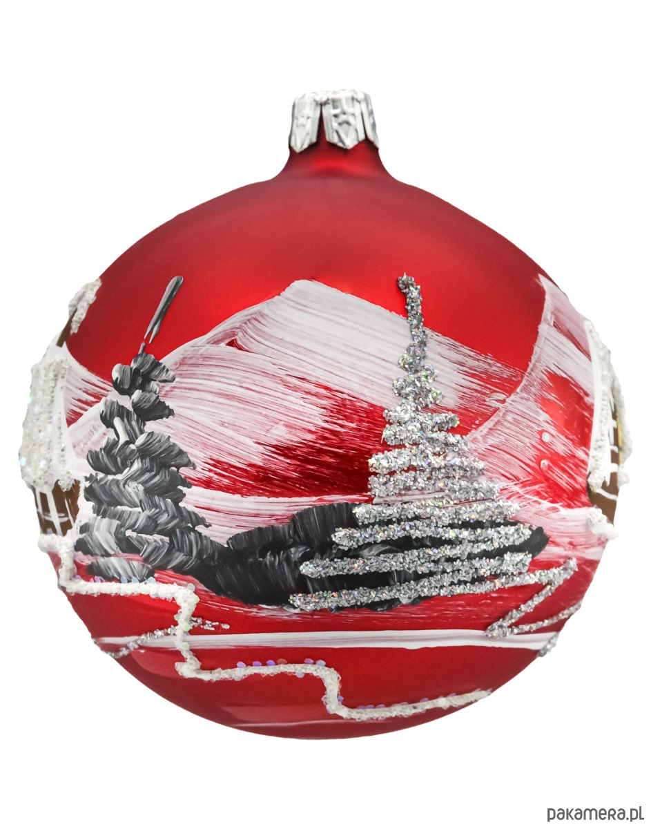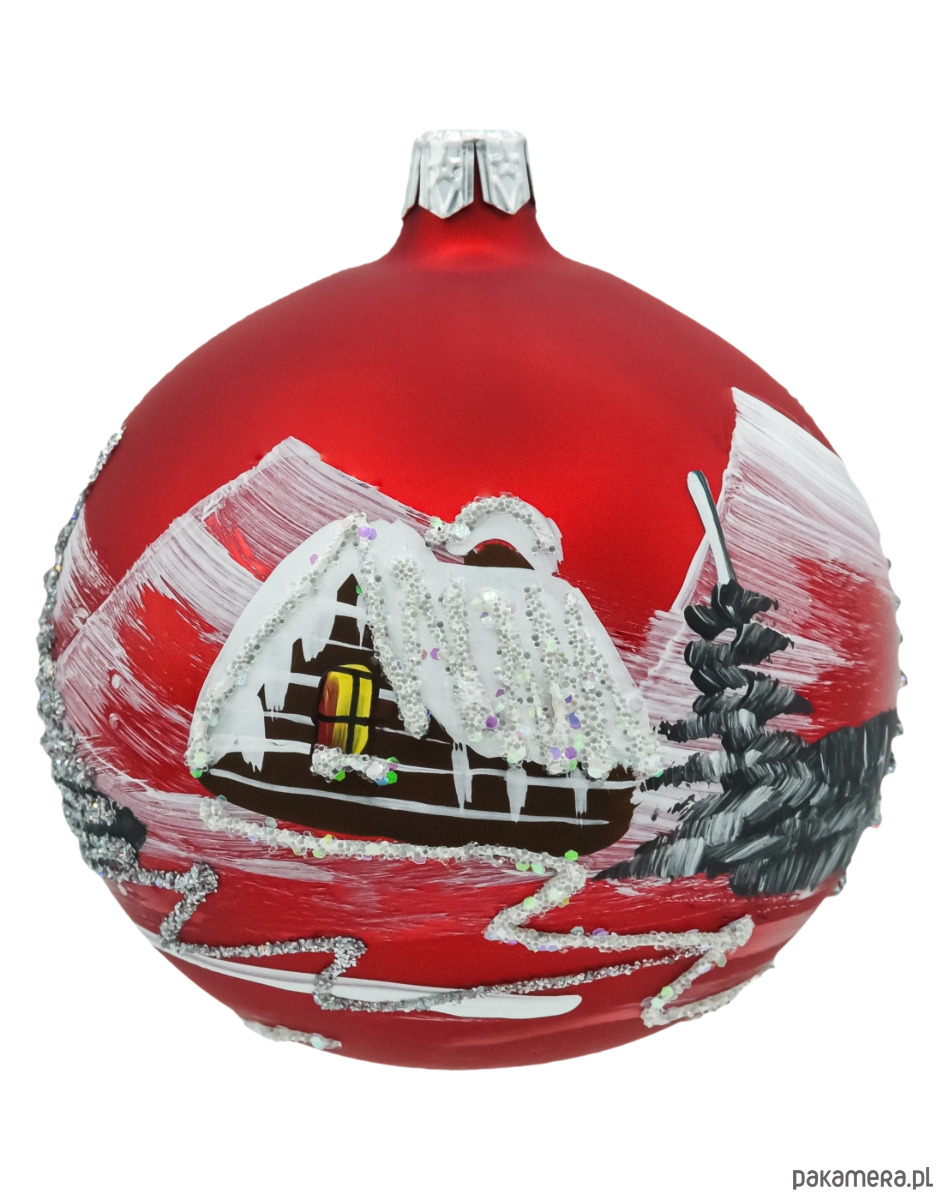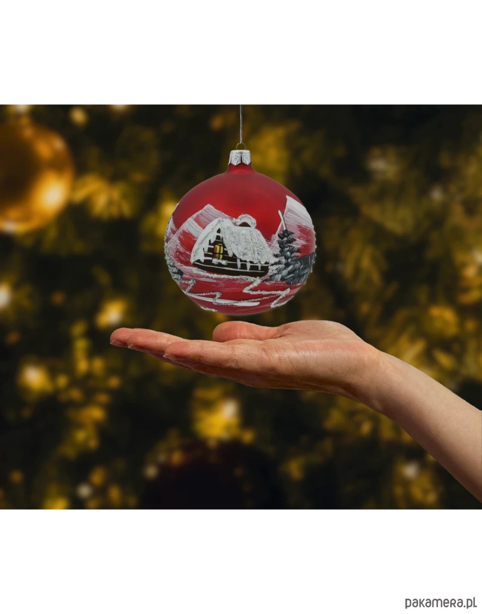 Szklana bombka choinkowa czerwona kula z zimową chatką to klasyka świątecznego wzornictwa w najlepszym wydaniu. Dmuchane szkło, ręcznie malowany pejzaż – ośnieżona górska chata, świerki i migoczący brokat – oraz elegancka, satynowa czerwień tworzą dekorację, która pięknie rozświetla gałązki choinki i wnosi do wnętrza ciepło domowych świąt. Każdy egzemplarz jest unikatowy: mistrzowie zdobnictwa nakładają farby i brokat pędzlem, dzięki czemu linie śniegu, faktura drzewek i połysk kryształków subtelnie się różnią. Bombka świetnie komponuje się z dekoracjami w stylu klasycznym, rustykalnym i skandynawskim, a neutralny motyw zimowego krajobrazu pasuje do choinek naturalnych i sztucznych. Ozdoba jest lekka, ma metalową zawieszkę i przychodzi w kartonowym pudełku z okienkiem – idealnym do przechowywania lub na prezent. Wybierz tę ręcznie zdobioną bombkę ze szkła dmuchanego i zbuduj na choince nastrojową, świąteczną opowieść.