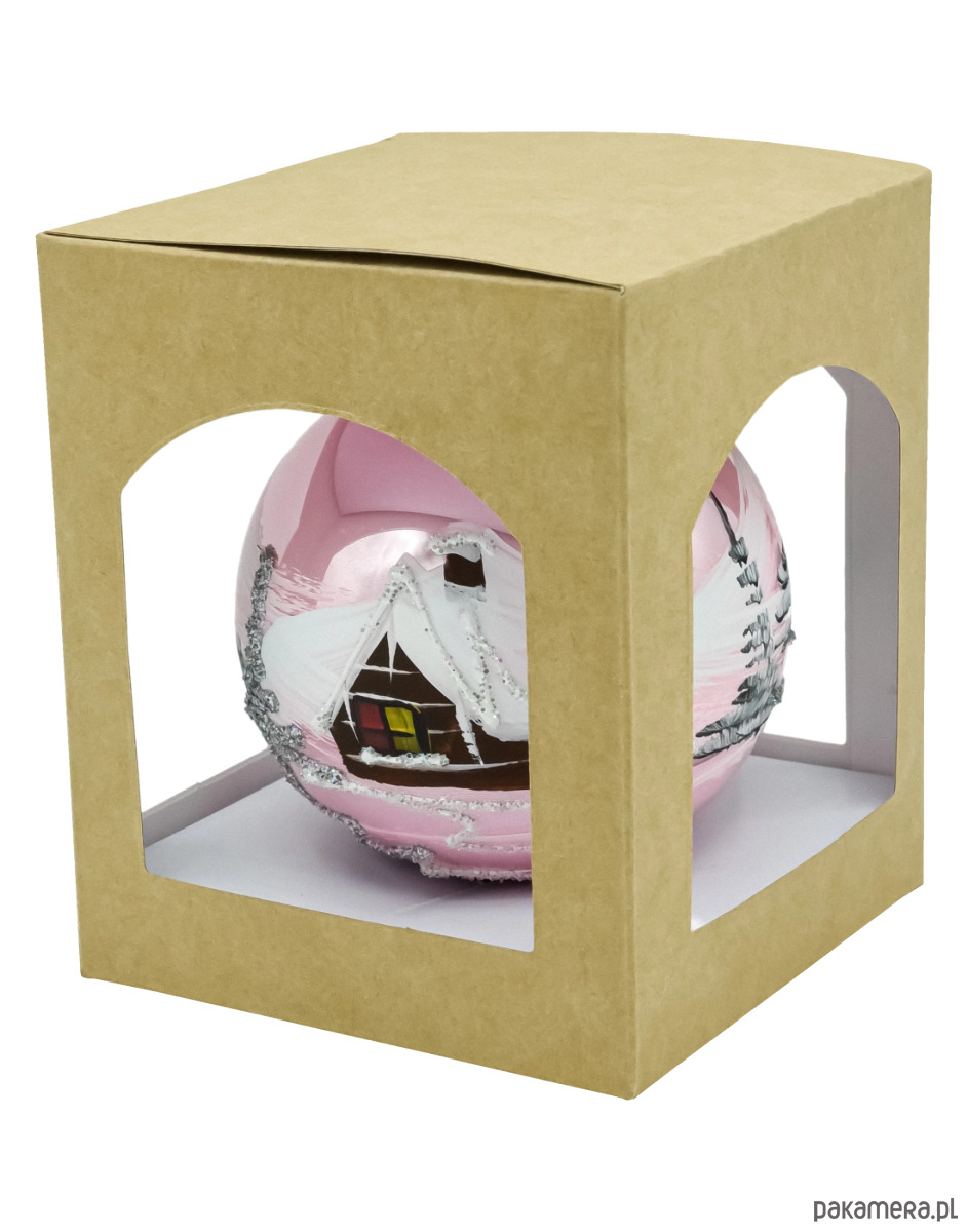 Ta elegancka bombka szklana kula w odcieniu delikatnego różu została ręcznie malowana i zdobiona połyskującym brokatem. Na powierzchni widnieje klasyczny zimowy pejzaż – drewniany domek okryty śniegiem, górskie zbocza, choinki i połyskująca, brokatowa droga. Lustrzana poświata szkła pięknie odbija światło lampek, a warstwowe pociągnięcia farby tworzą efekt 3D. To ponadczasowa ozdoba choinkowa w stylu retro, która wprowadza na choinkę klimat świąt i domowego ciepła.