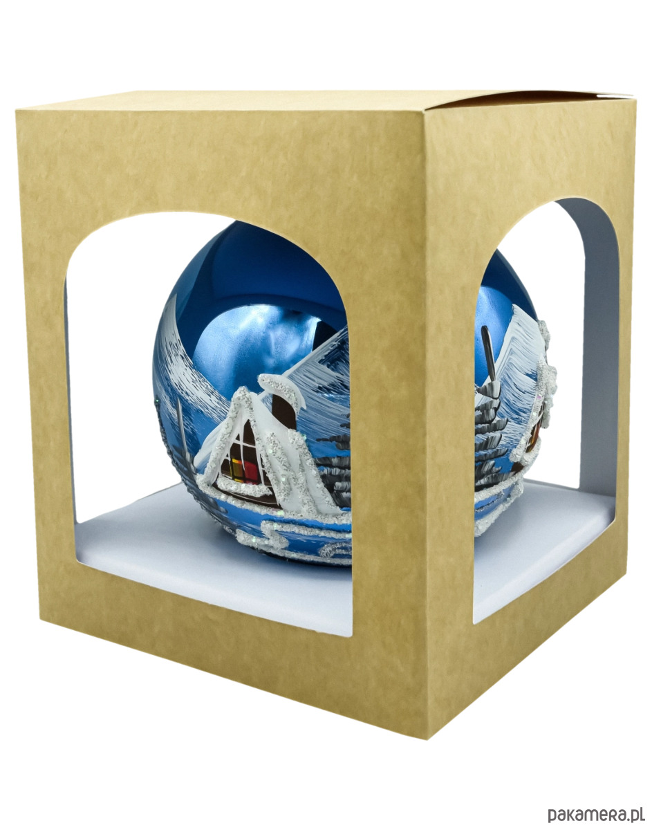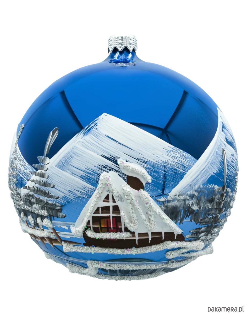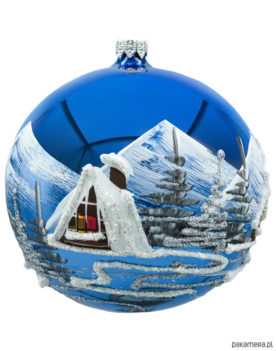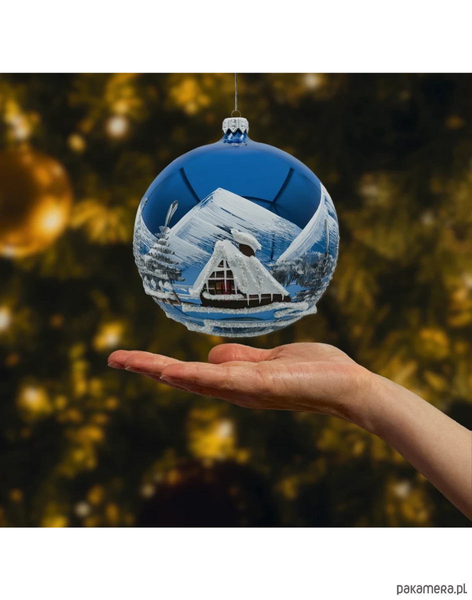 Elegancka bombka choinkowa o średnicy 12 cm wykonana z lekkiego, dmuchanego szkła. Powierzchnia w głębokim, granatowym odcieniu stanowi tło dla ręcznie malowanego motywu zimowej wioski: gór, świerków i przytulnych domków z ośnieżonymi dachami. Kontury i śnieżne akcenty zostały podkreślone srebrnym brokatem, dzięki czemu bombka pięknie mieni się w świetle lampek. Każda sztuka powstaje ręcznie – każda jest unikatowa. Zwieńczeniem jest srebrna czapeczka z oczkiem do wygodnego zawieszenia. Bombka zapakowana jest w ozdobne pudełko z okienkiem, idealne na prezent i bezpieczne przechowywanie po sezonie.