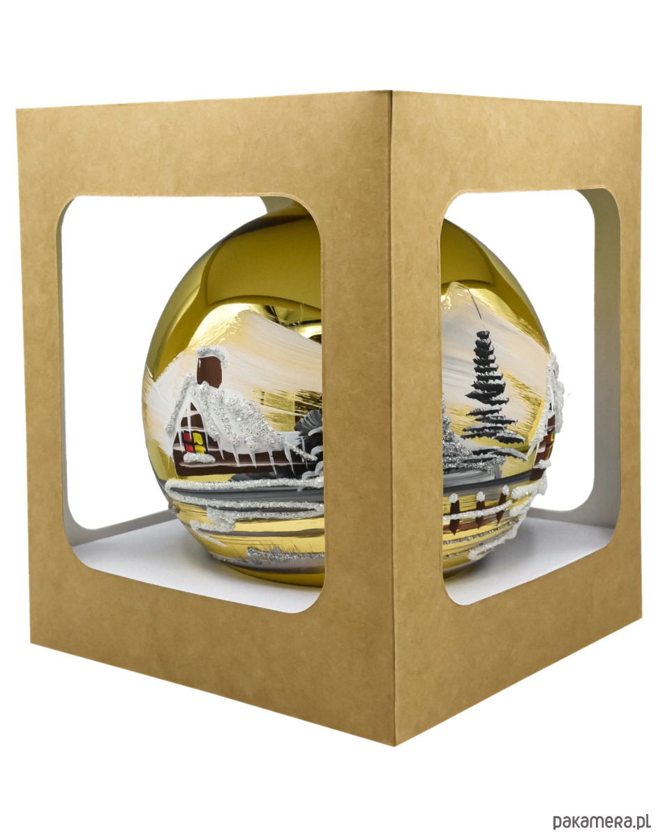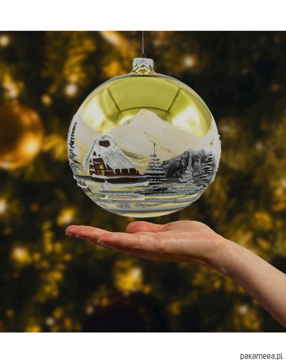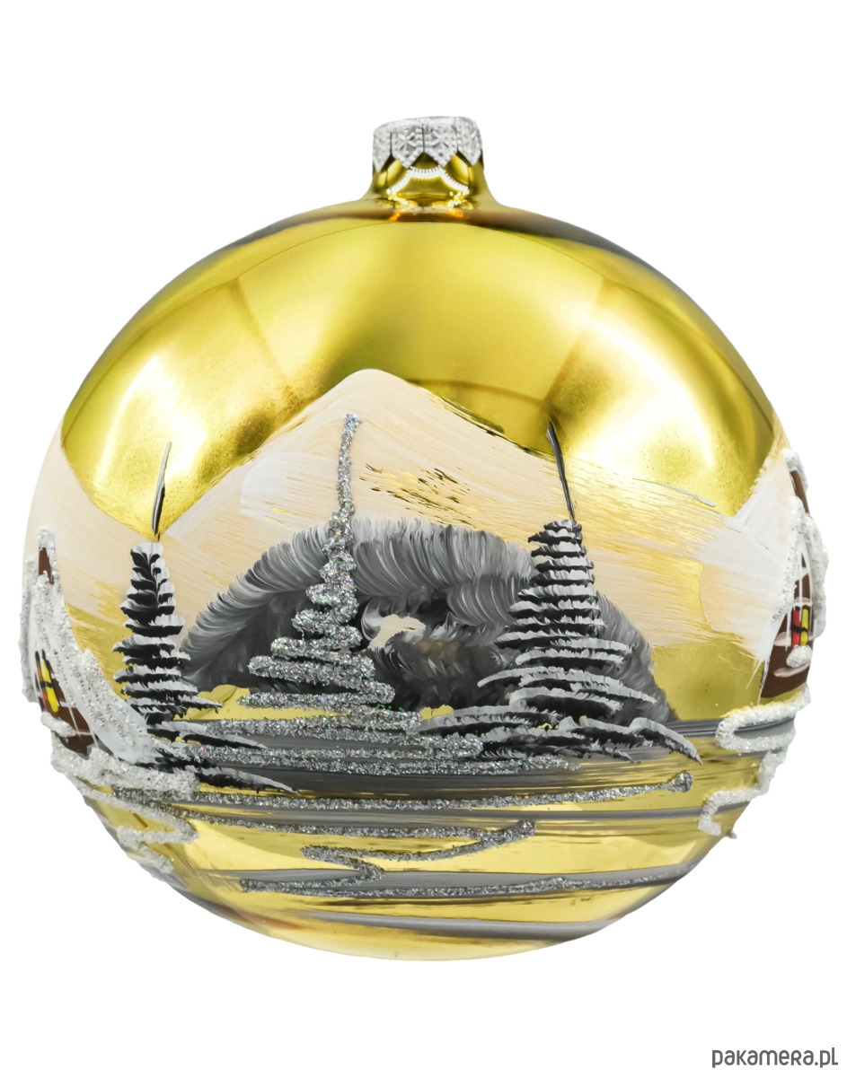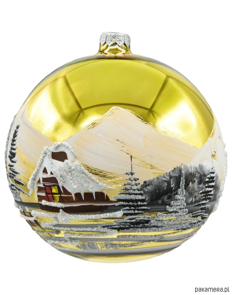 Elegancka bombka szklana 15 cm w szlachetnym, lustrzanym odcieniu złota. Powierzchnię zdobi ręcznie malowany zimowy pejzaż: górski masyw, świerki obsypane szronem oraz przytulny domek z rozświetlonymi oknami. Kontury śniegu podkreślono drobnoziarnistym brokatem, który pięknie mieni się w świetle choinkowych lampek. To okazała, efektowna ozdoba choinkowa premium, która natychmiast staje się centralnym punktem dekoracji.