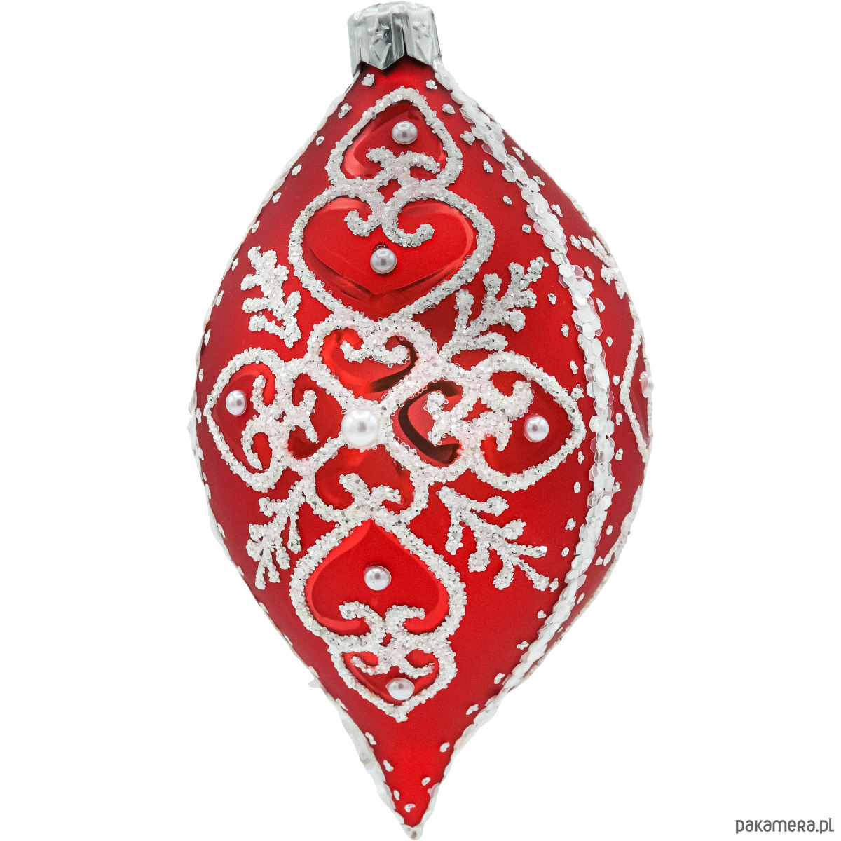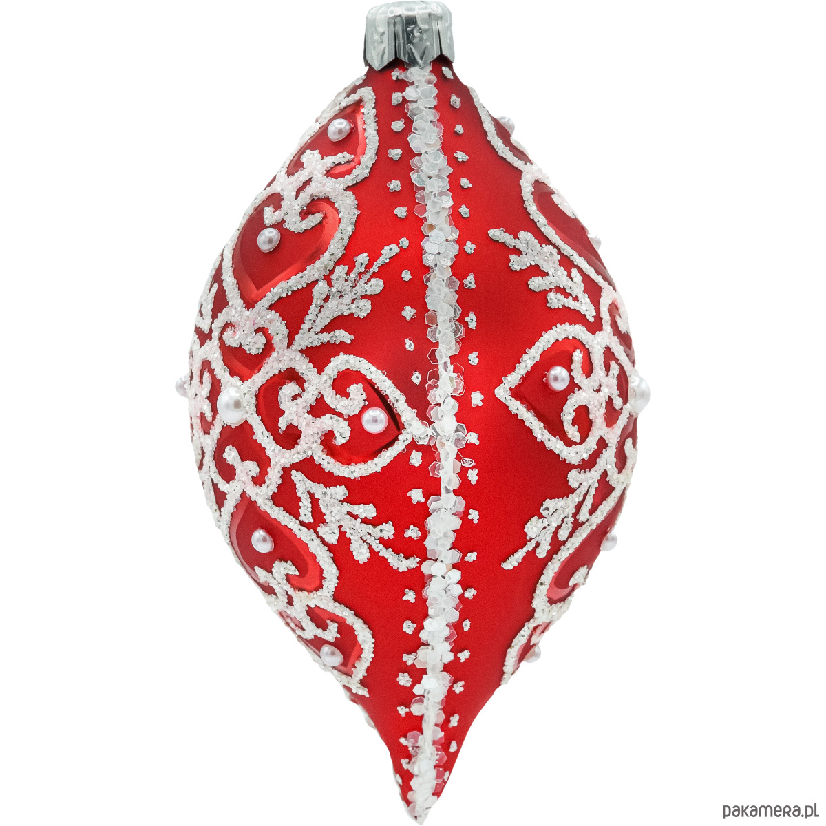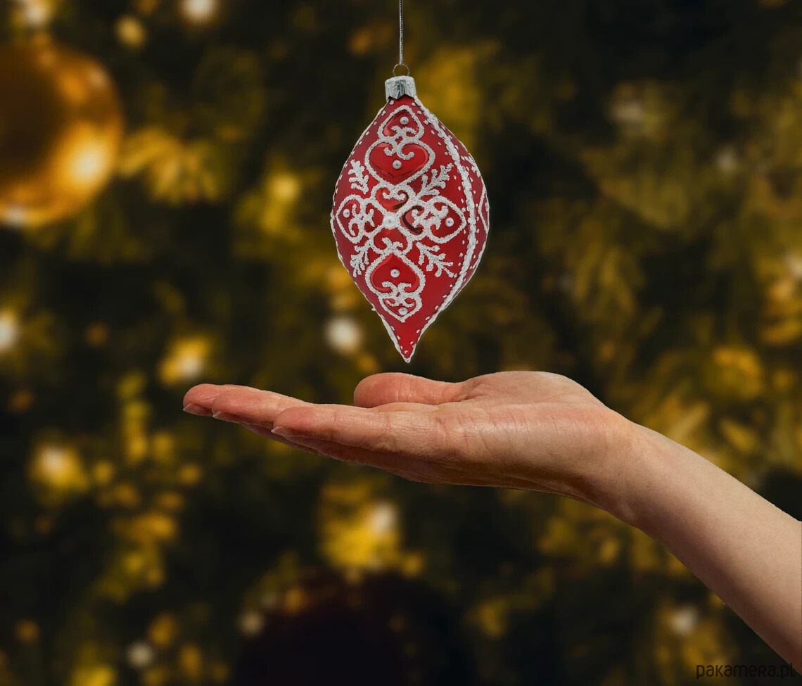 Elegancka bombka owalna (łezka) ze szkła dmuchanego to klasyk w świątecznym wydaniu glamour. Głęboka, matowa czerwień została pokryta misternym, wypukłym ornamentem w kolorze śnieżnej bieli – przypominającym koronkę i zimowe gałązki. Dekor wykończono brokatowym „szronem”, drobnymi perełkami oraz kryształkową linią biegnącą przez oś bombki, dzięki czemu ozdoba pięknie łapie światło lampek choinkowych. Każdy egzemplarz jest ręcznie malowany i zdobiony, więc ma swój unikalny charakter – to prawdziwe polskie rękodzieło w najwyższej jakości.