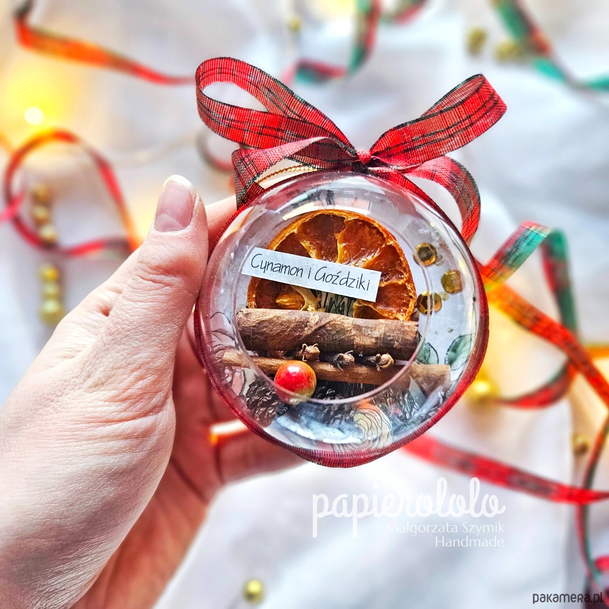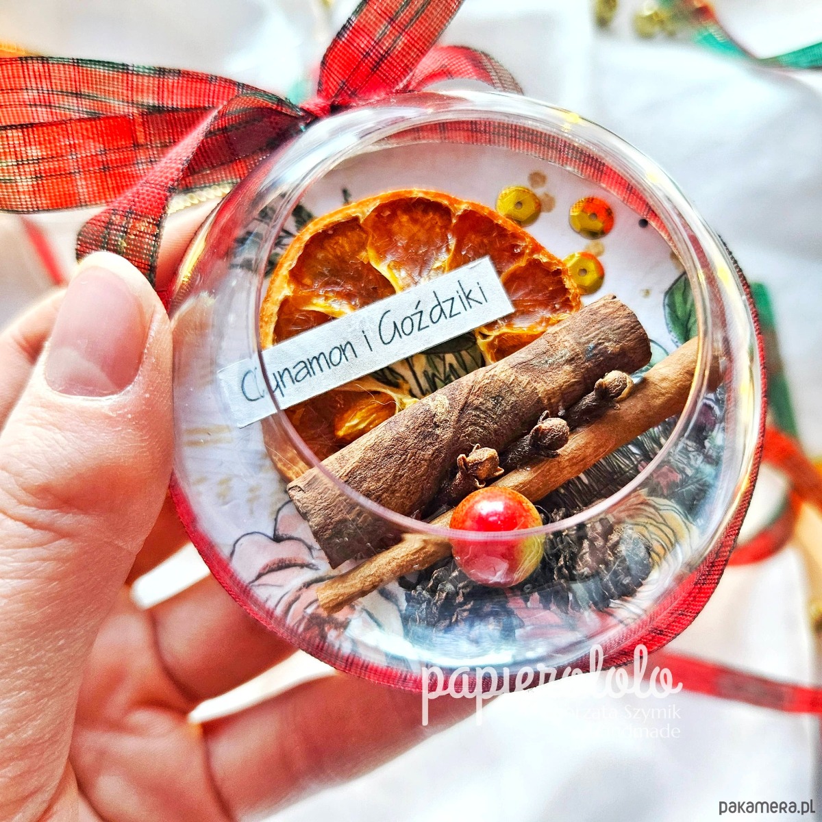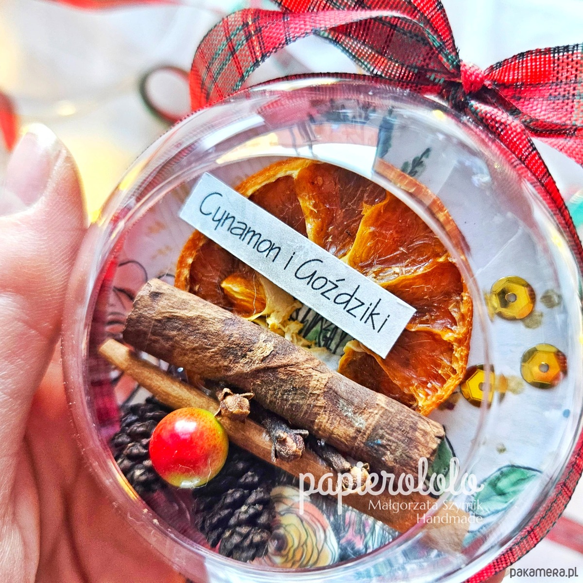 Akrylowy klosz otoczony świateczną wstążką, a w środku na arkuszu papieru ozdobna zawartość w postaci pachnącego plastra mandarynki, cynamonu i goździków. Do tego dodatki w postaci szyszki, kuleczki "jagody" i napisu.