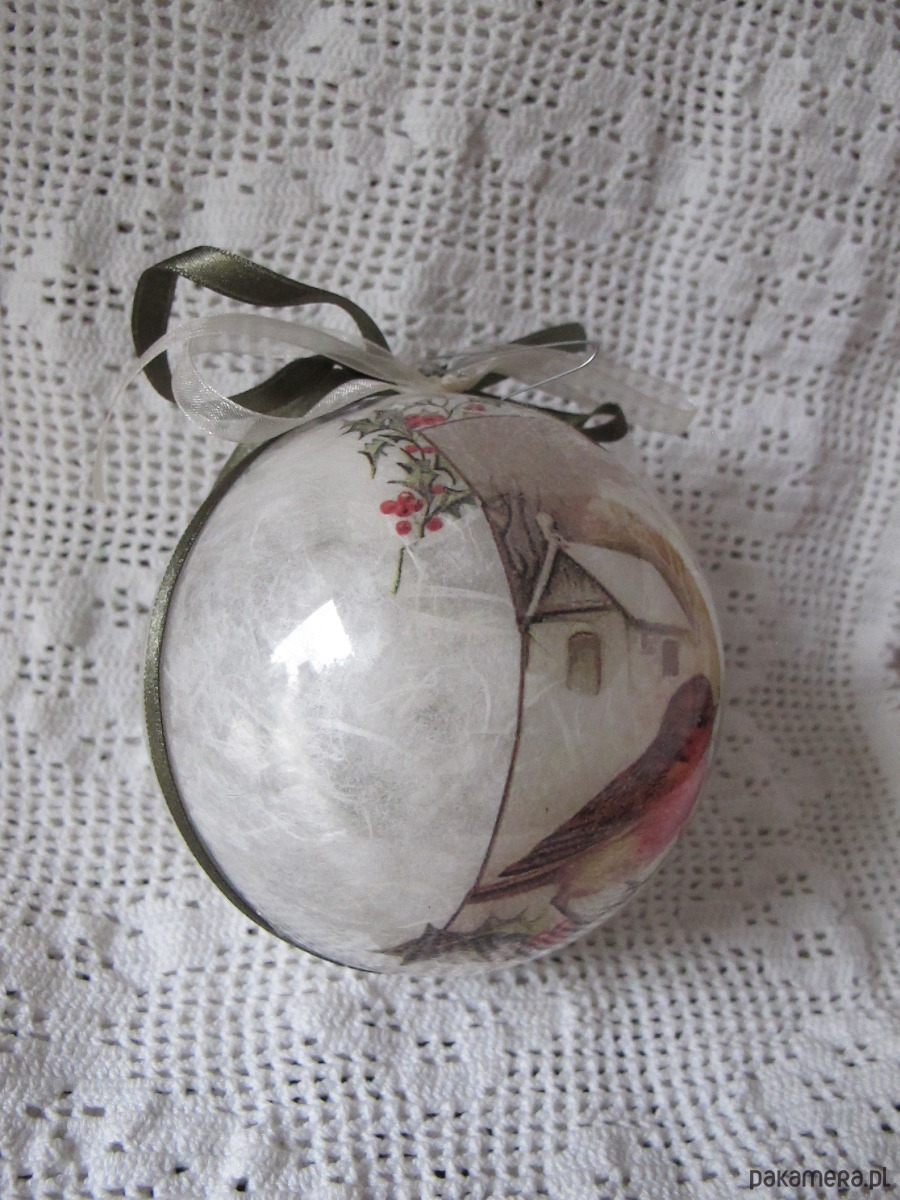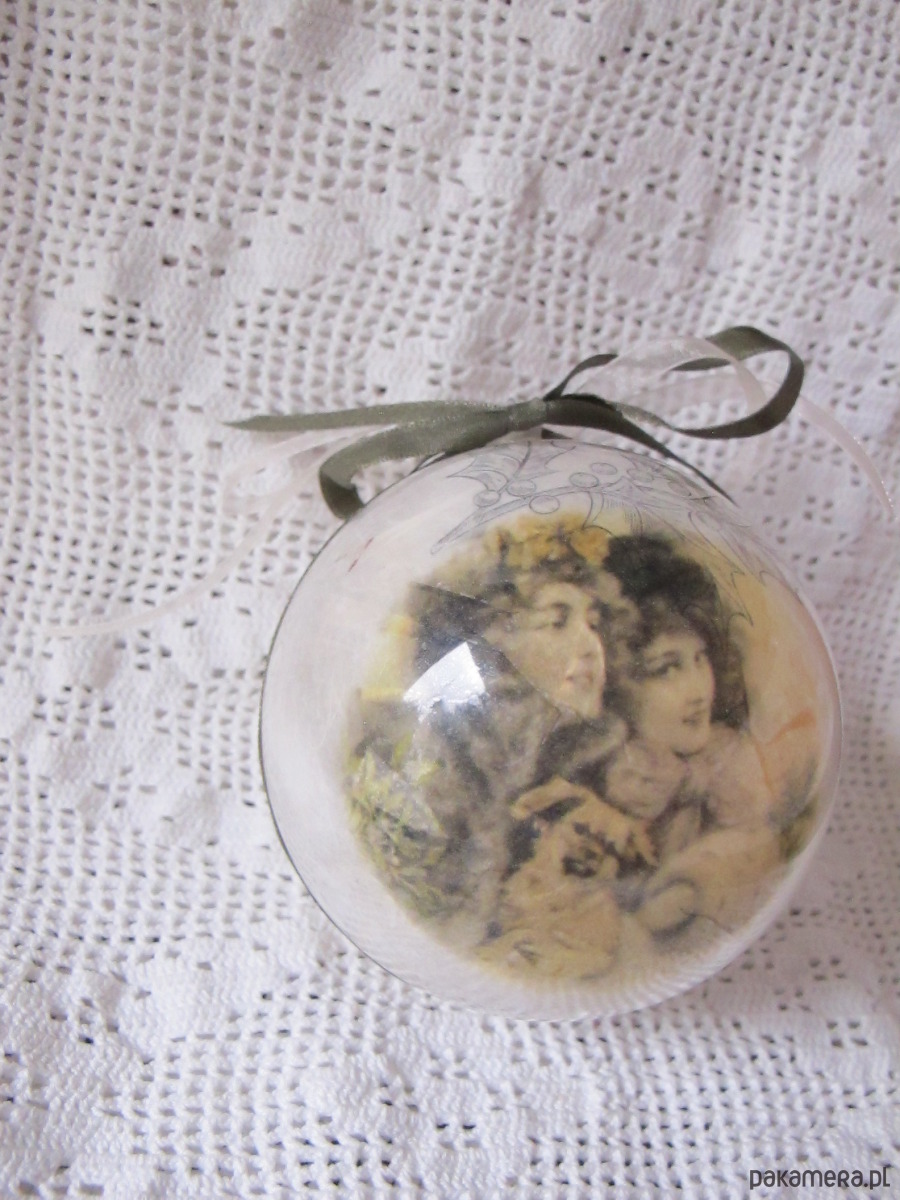 Bombka z plexiglasu, dekorowana ręcznie od środka w technice serwetkowej/decoupage/.Dekoracja, widoczna z obu stron. Wokół osi, trwale doklejona atłasowa wstążka. Bombka posiada zawieszkę z metalu w kolorze srebrnym. Wymiary bombki : średnica 10cm. Bombka jest bardzo lekka, lekko transparentna z efektem szkła, trwała. Polecam na prezent.