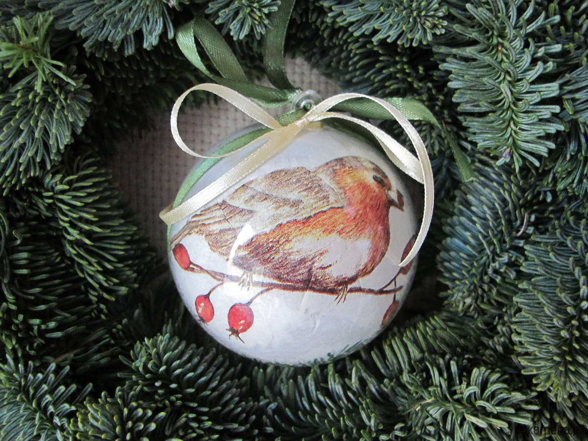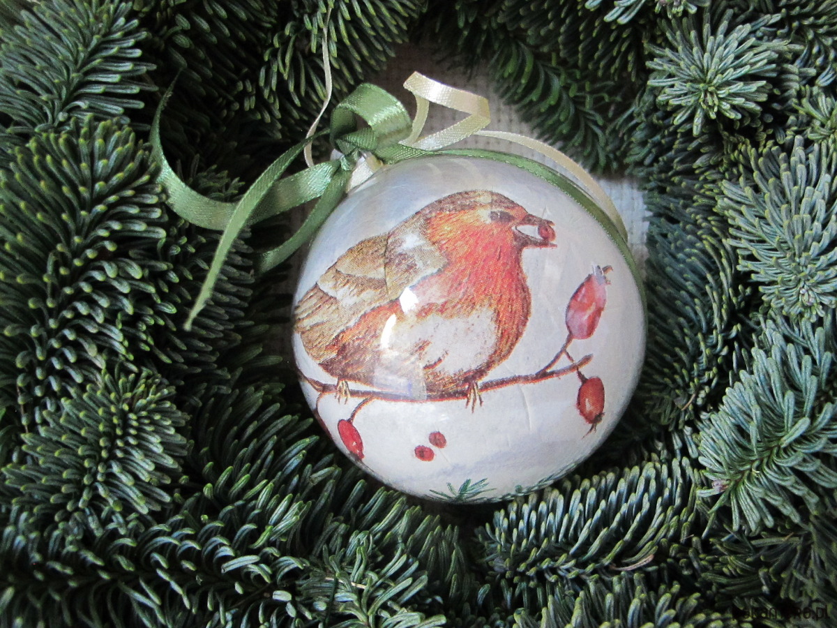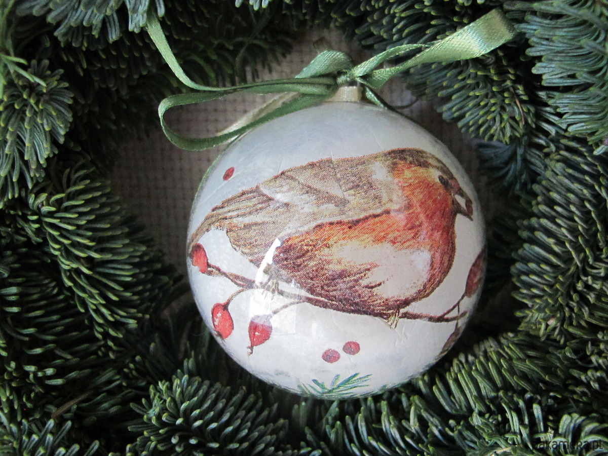 Bombka z plexiglasu, dekorowana ręcznie od środka w technice serwetkowej/decoupage/.Dekoracja Rudzik widoczna z obu stron bombki. Wokół osi, trwale doklejona atłasowa wstążka. Bombka posiada zawieszkę z metalu w kolorze srebrnym. Wymiary bombki : średnica 8 cm. Bombka jest bardzo lekka, lekko transparentna z efektem szkła, trwała. Polecam na prezent.
