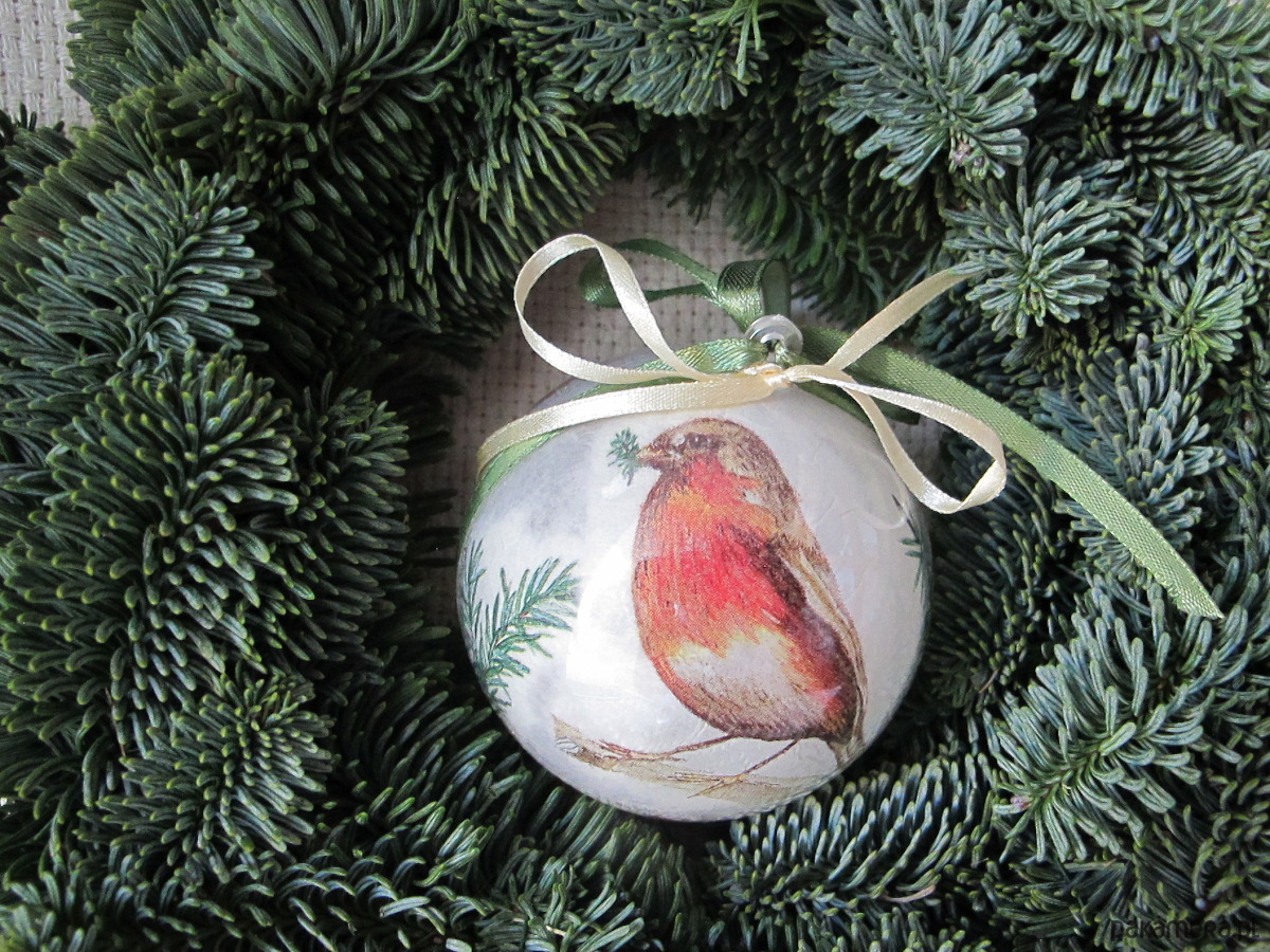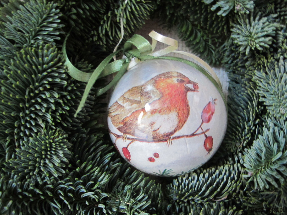 Bombka z plexiglasu, dekorowana ręcznie od środka w technice serwetkowej/decoupage/.Dekoracja Rudzik widoczna z obu stron bombki. Wokół osi, trwale doklejona atłasowa wstążka. Bombka posiada zawieszkę z metalu w kolorze srebrnym. Wymiary bombki : średnica 8 cm. Bombka jest bardzo lekka, lekko transparentna z efektem szkła, trwała. Polecam na prezent.