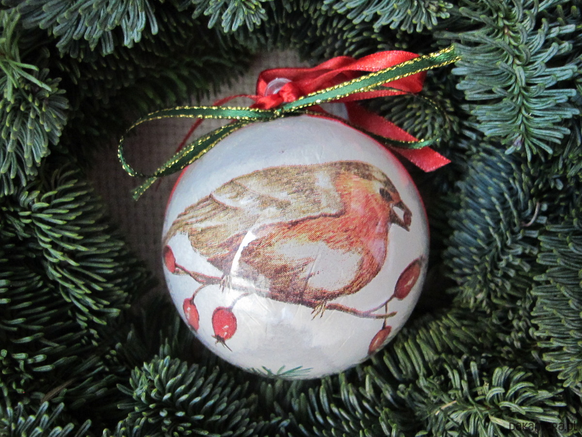 Bombka z plexiglasu, dekorowana ręcznie od środka w technice serwetkowej/decoupage/.Dekoracja Rudzik widoczna z obu stron bombki. Wokół osi, trwale doklejona atłasowa wstążka. Bombka posiada zawieszkę z metalu w kolorze srebrnym. Wymiary bombki : średnica 8 cm. Bombka jest bardzo lekka, lekko transparentna z efektem szkła, trwała. Polecam na prezent.