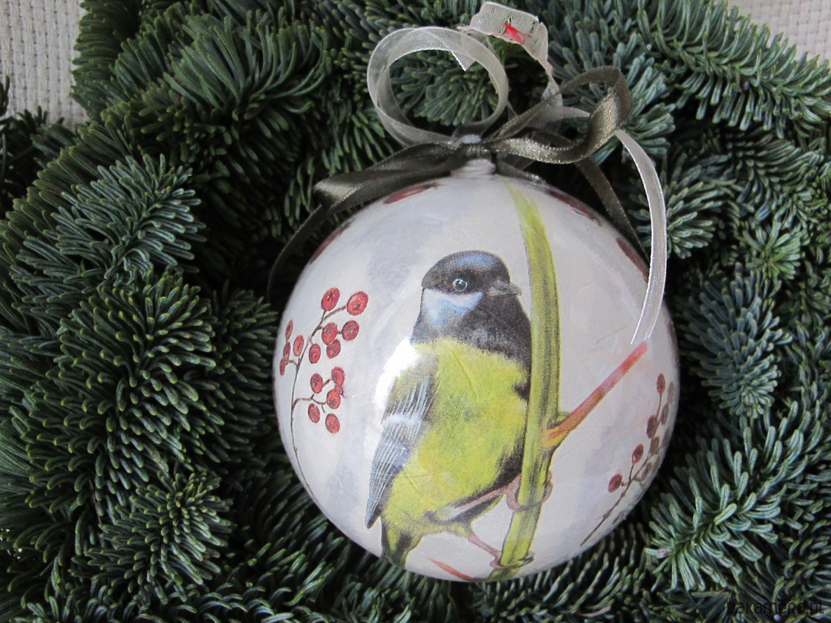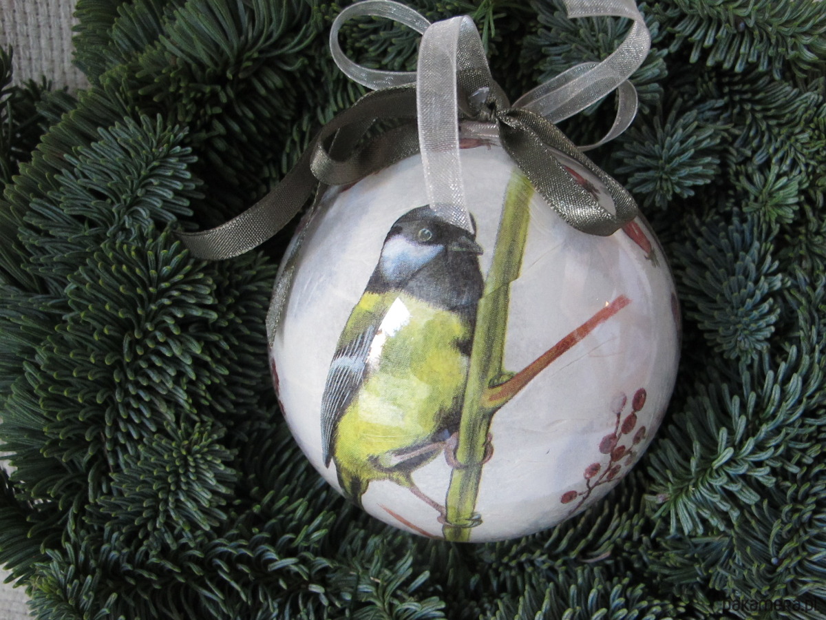Bombka z plexiglasu, dekorowana ręcznie od środka w technice serwetkowej/decoupage/.Dekoracja Sikorka widoczna z obu stron. Wokół osi, trwale doklejona atłasowa wstążka. Bombka posiada zawieszkę z metalu w kolorze srebrnym. Wymiary bombki : średnica 10cm. Bombka jest bardzo lekka, lekko transparentna z efektem szkła, trwała. Polecam na prezent.