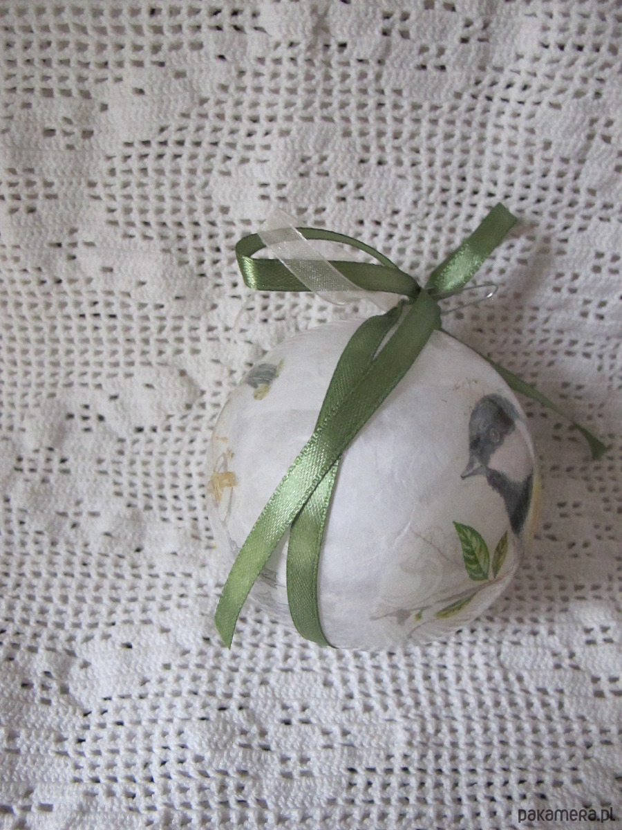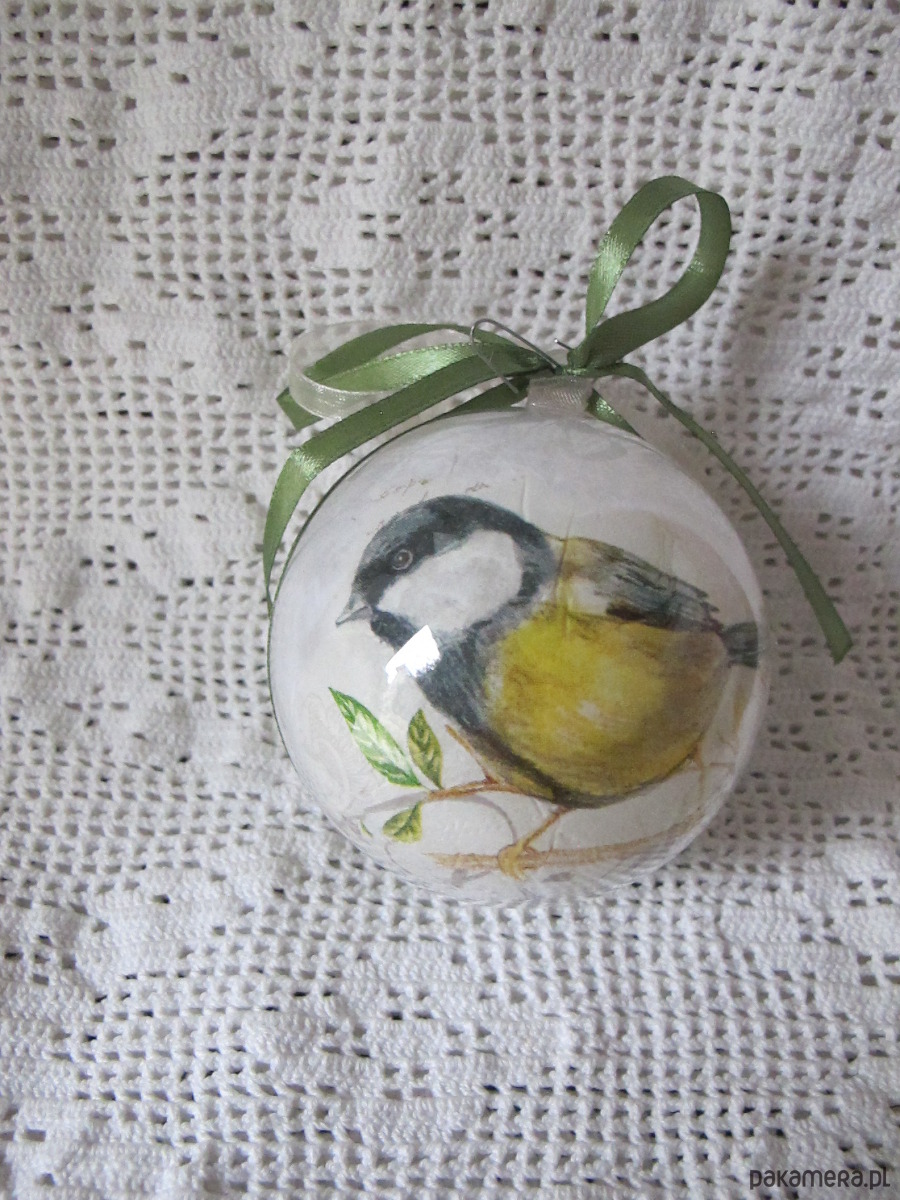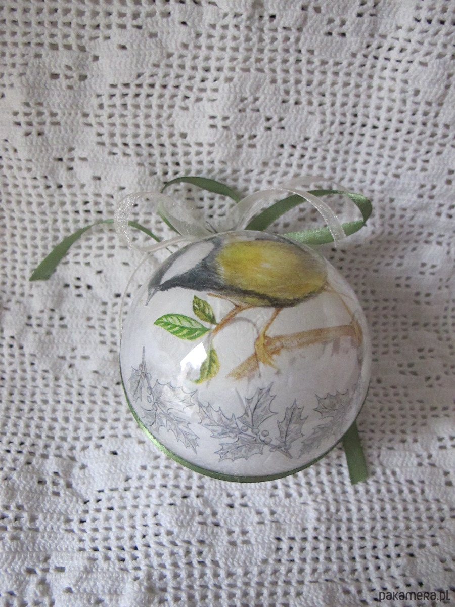 Bombka z plexiglasu, dekorowana ręcznie od środka w technice serwetkowej/decoupage/.Dekoracja Sikorka widoczna z obu stron bombki. Wokół osi, trwale doklejona atłasowa wstążka. Bombka posiada zawieszkę z metalu w kolorze srebrnym. Wymiary bombki : średnica 8 cm. Bombka jest bardzo lekka, lekko transparentna z efektem szkła, trwała. Polecam na prezent.