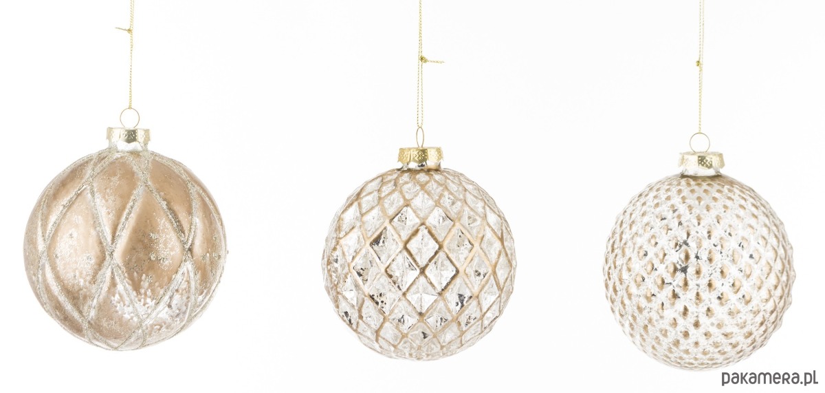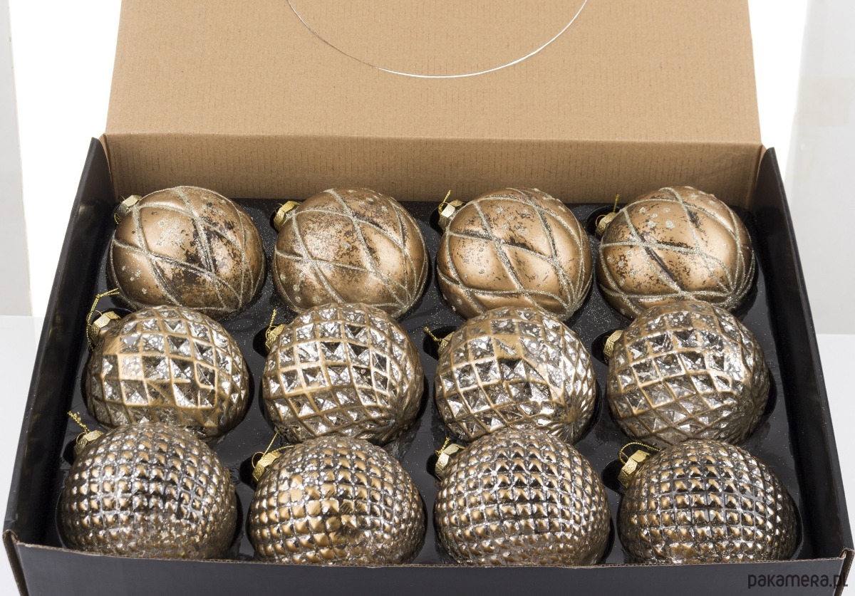 Komplet 12 bombek wykonanych z dmuchanego szkła. Trzy wzory. W kolorze złotym. Będą pięknie błyszczały na choince.