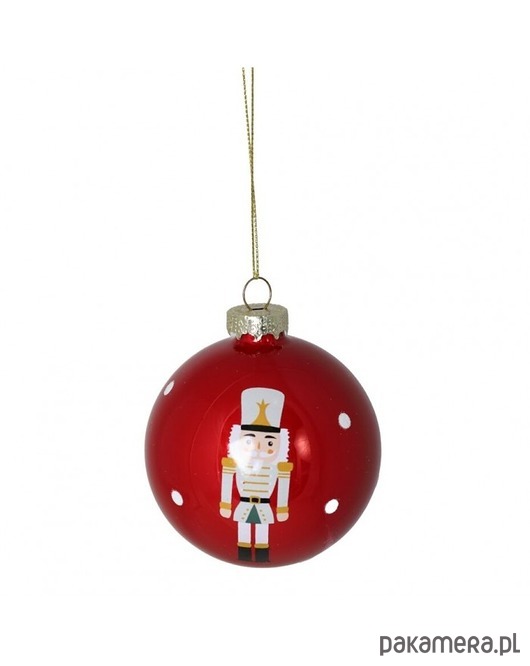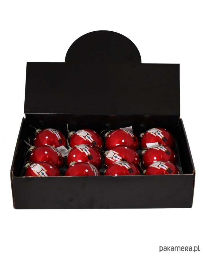 Zestaw 12 szt. szklanych bombek choinkowych. W kolorze czerwonym. Ozdobione motywem Dziadka do Orzechów.