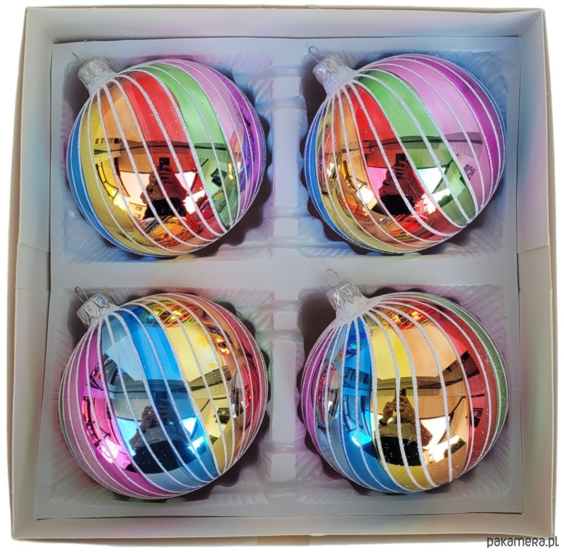 Komplet 4 przepięknych bombek. Zostały wykonane z dmuchanego szkła i ręcznie ozdobione. Wykorzystano ludowe wzory, które pieczołowicie przeniesiono na szklane cudeńka. Każda bombka jest inna ze względu na tradycyjne wykonanie i indywidualne zdobienie.