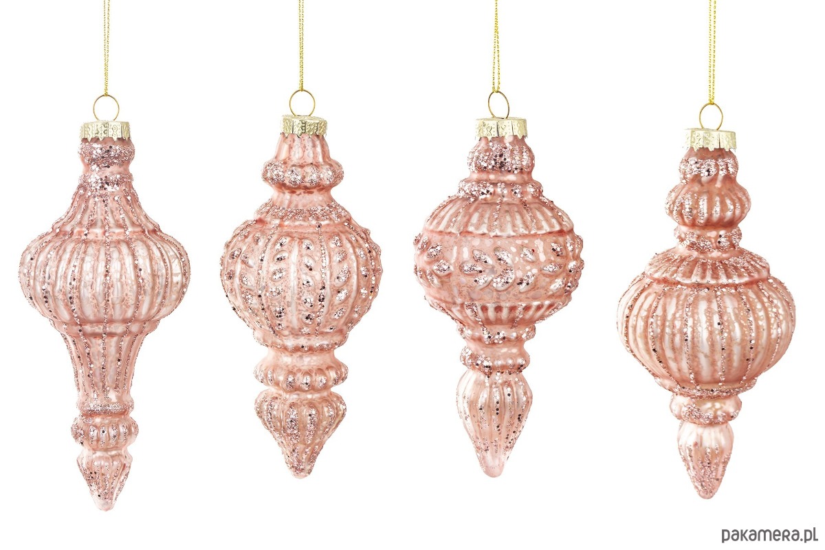 Komplet 4 różowych bombek szklanych z wytłoczonym wzorem. Bombki mają różne kształty i zdobienia. Wysoka jakość szkła gwarantuje trwałość i elegancję. Będą się pięknie prezentowały na choince.