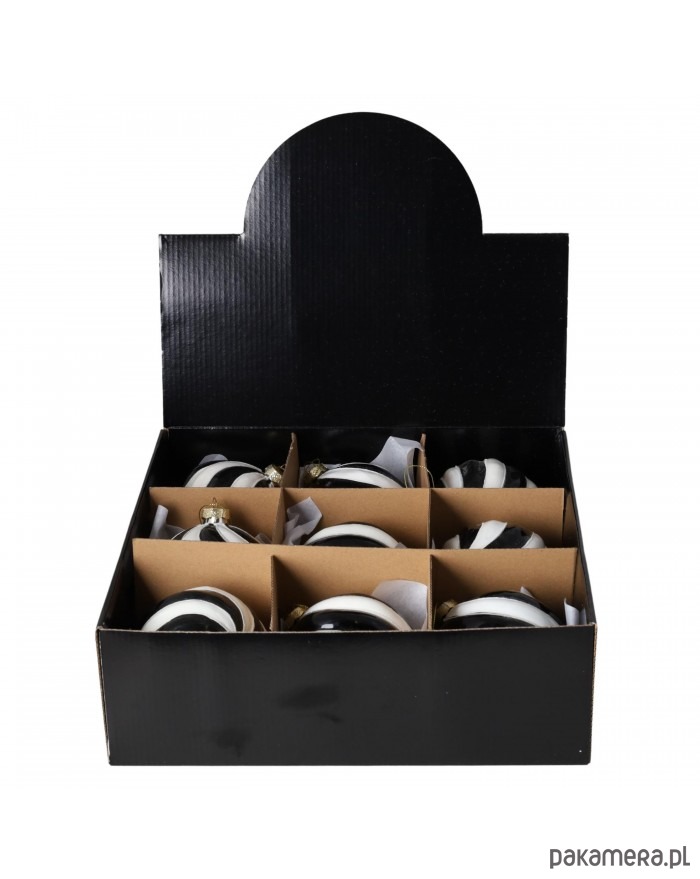 Komplet sześciu bombek wykonanych z dmuchanego szkła o średnicy 10 cm.