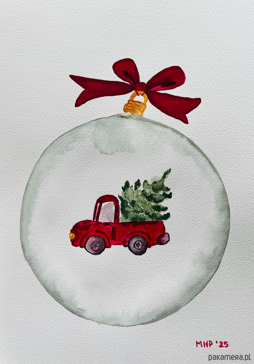 Bombka z autkiem to oryginalna akwarela namalowana na profesjonalnym papierze akwarelowym 300g. Format a4. Praca jest sygnowana z przodu oraz podpisana z tyłu.
