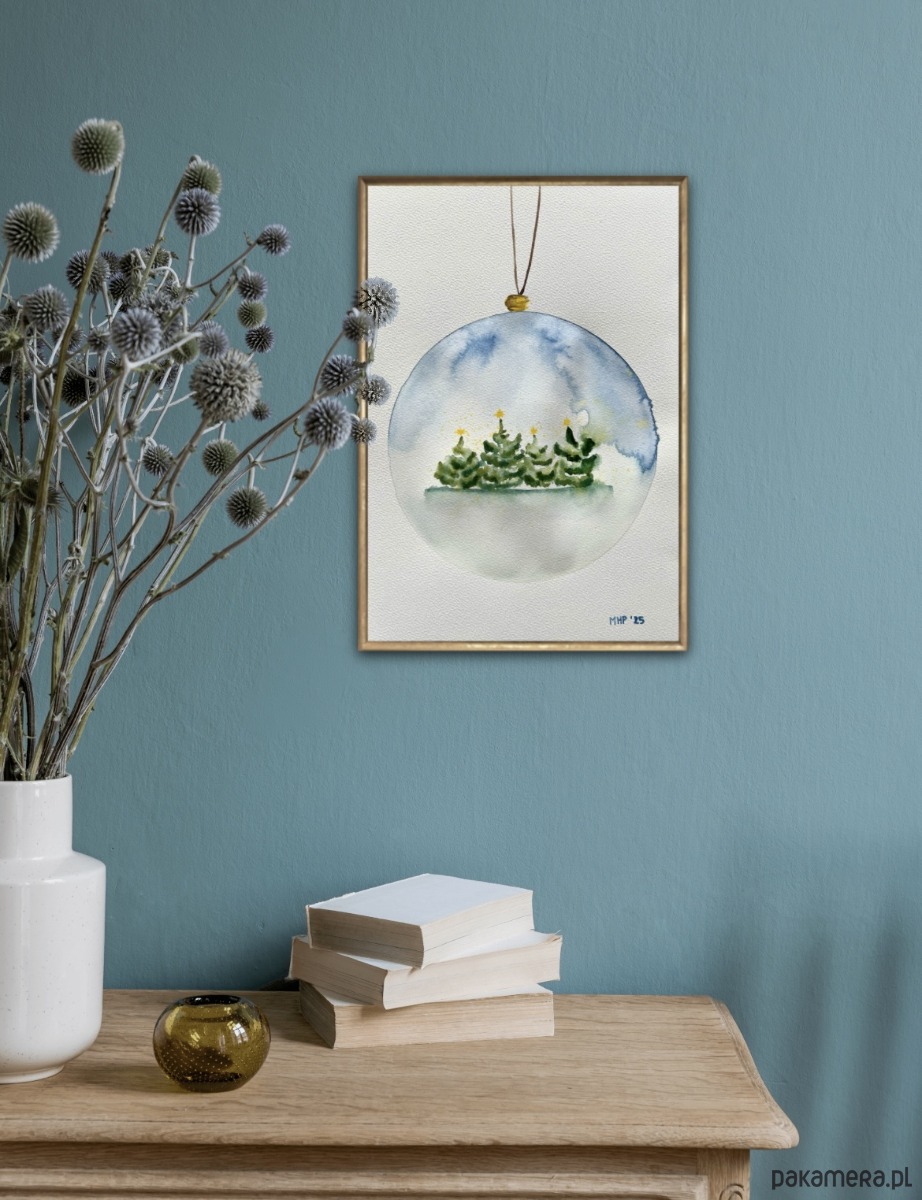 Bombka z choinkami to oryginalna akwarela namalowana na profesjonalnym papierze akwarelowym 300g. Format a4. Praca jest sygnowana z przodu oraz podpisana z tyłu.