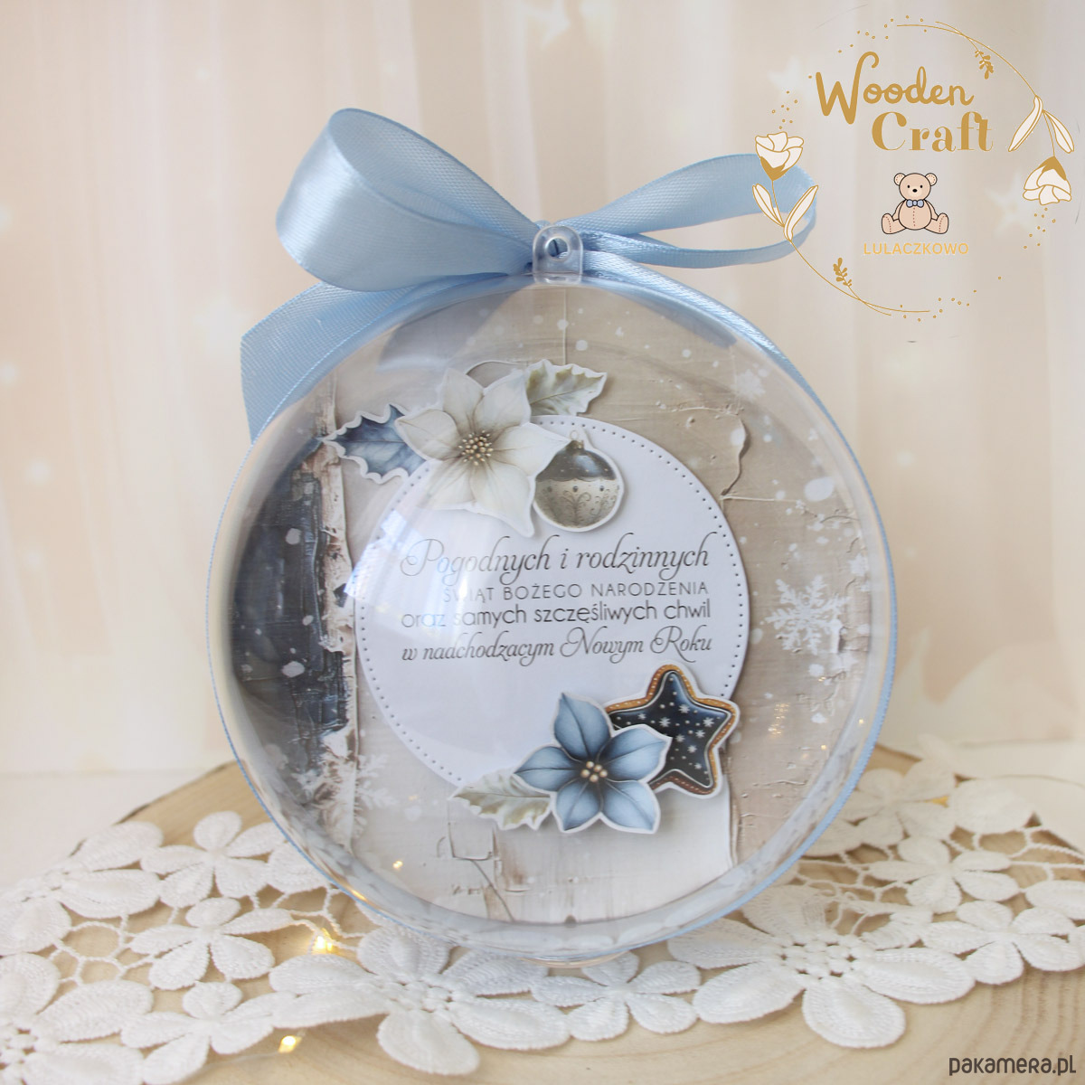 Bombka wykonana ręcznie z dbałością o każdy szczegół. We wnętrzu umieszczona została kompozycja z grafikami poinsecji oraz świątecznymi, a także przesłane przez Państwa zdjęcie maluszka. Na spodzie bombki znalazły się błyszczące cekiny gwiazdki oraz kuleczki imitujące śnieg. Na odwrocie bombki wklejone zostały życzenia świąteczne. Całość przewiązana błękitną kokardą.