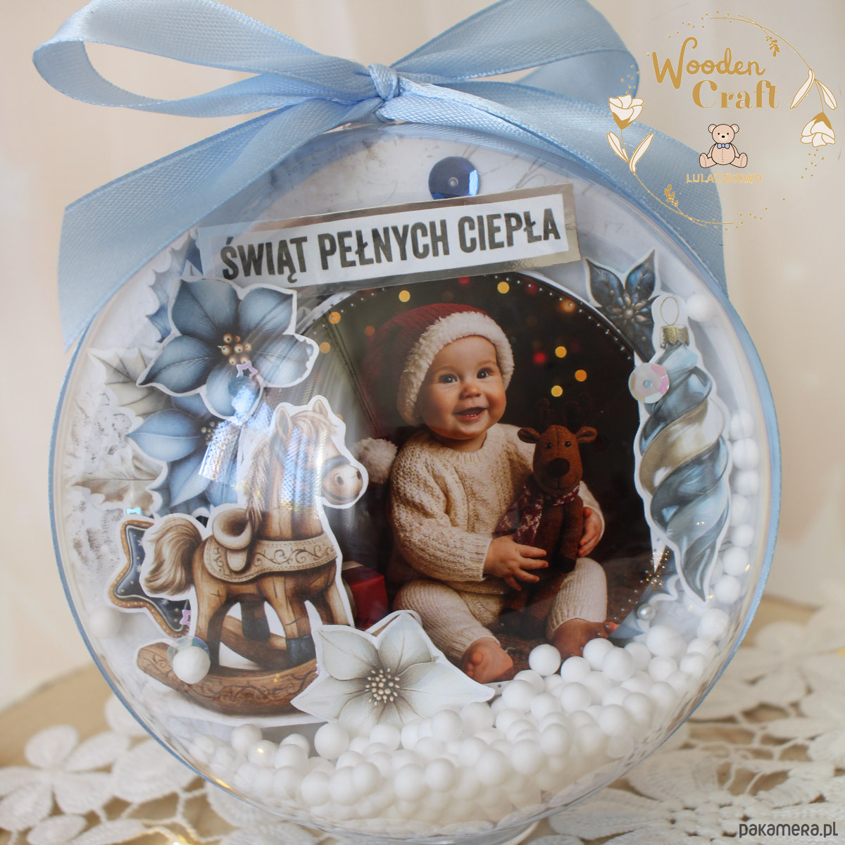 Przepiękna, bogato zdobiona bombka na choinkę ze zdjęciem dziecka i napisem "Świąt Pełnych Ciepła" - idealna jako pamiątka z pierwszych świąt maluszka lub np. prezent dla dziadków.