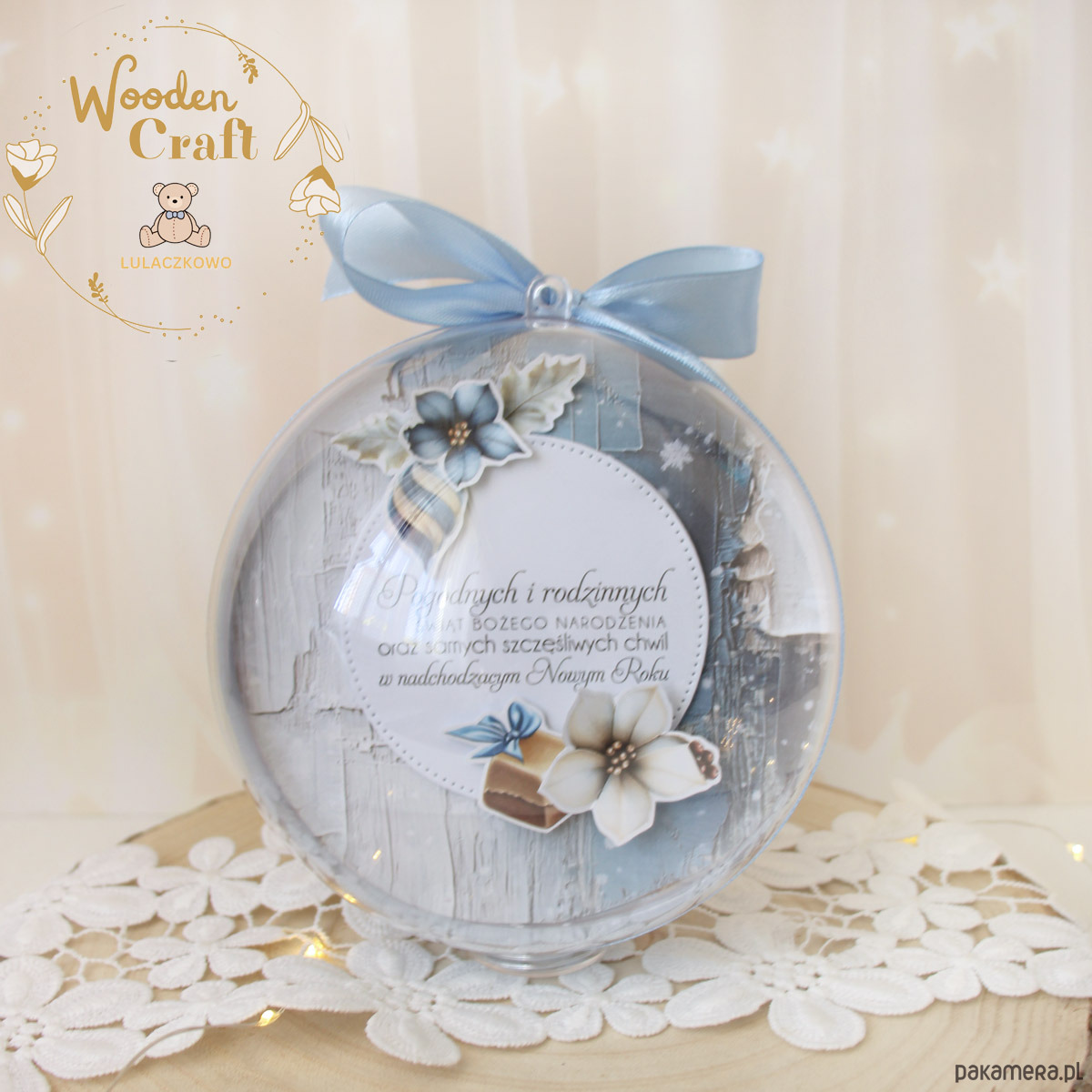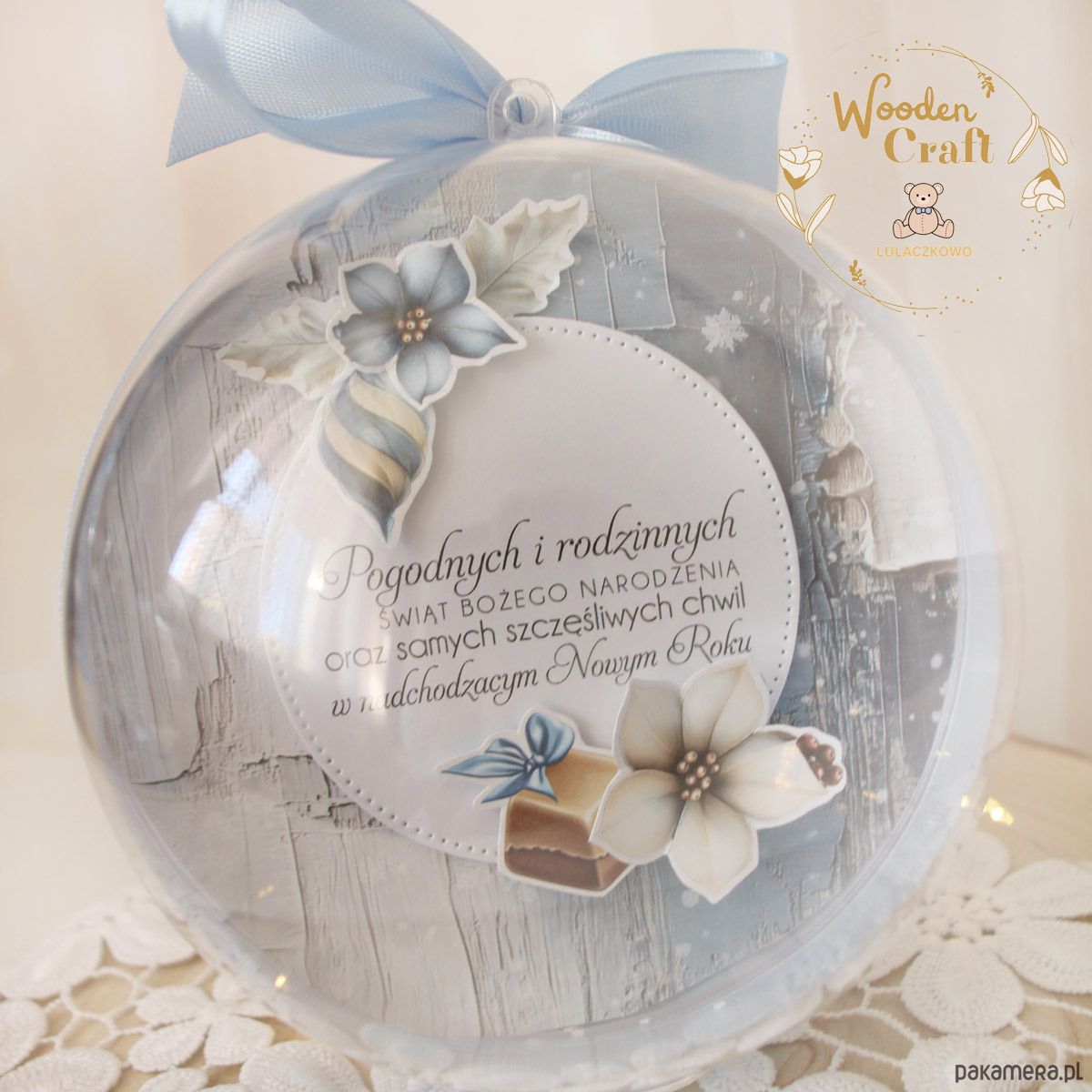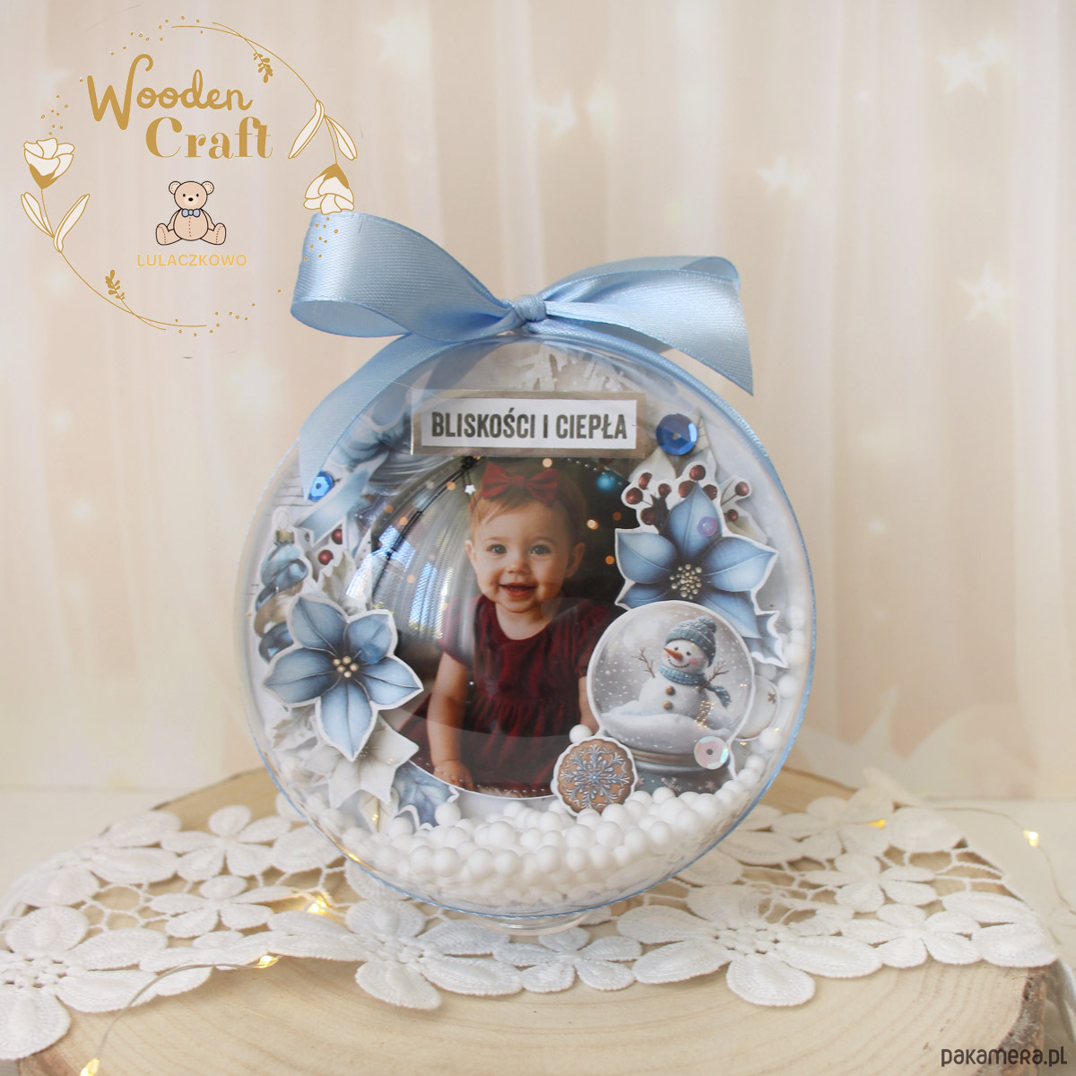 Bombka wykonana ręcznie z dbałością o każdy szczegół. We wnętrzu umieszczona została kompozycja z grafikami poinsecji oraz świątecznymi, a także przesłane przez Państwa zdjęcie maluszka. Na spodzie bombki znalazły się błyszczące cekiny gwiazdki oraz kuleczki imitujące śnieg. Na odwrocie bombki wklejone zostały życzenia świąteczne. Całość przewiązana błękitną kokardą.