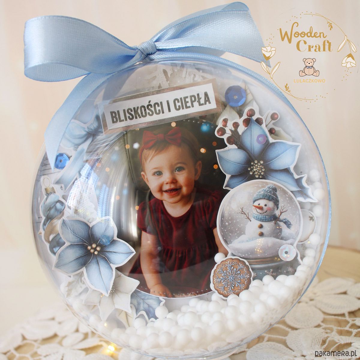 Przepiękna, bogato zdobiona bombka na choinkę ze zdjęciem dziecka i napisem "Bliskości i Ciepła" - idealna jako pamiątka z pierwszych świąt maluszka lub np. prezent dla dziadków.