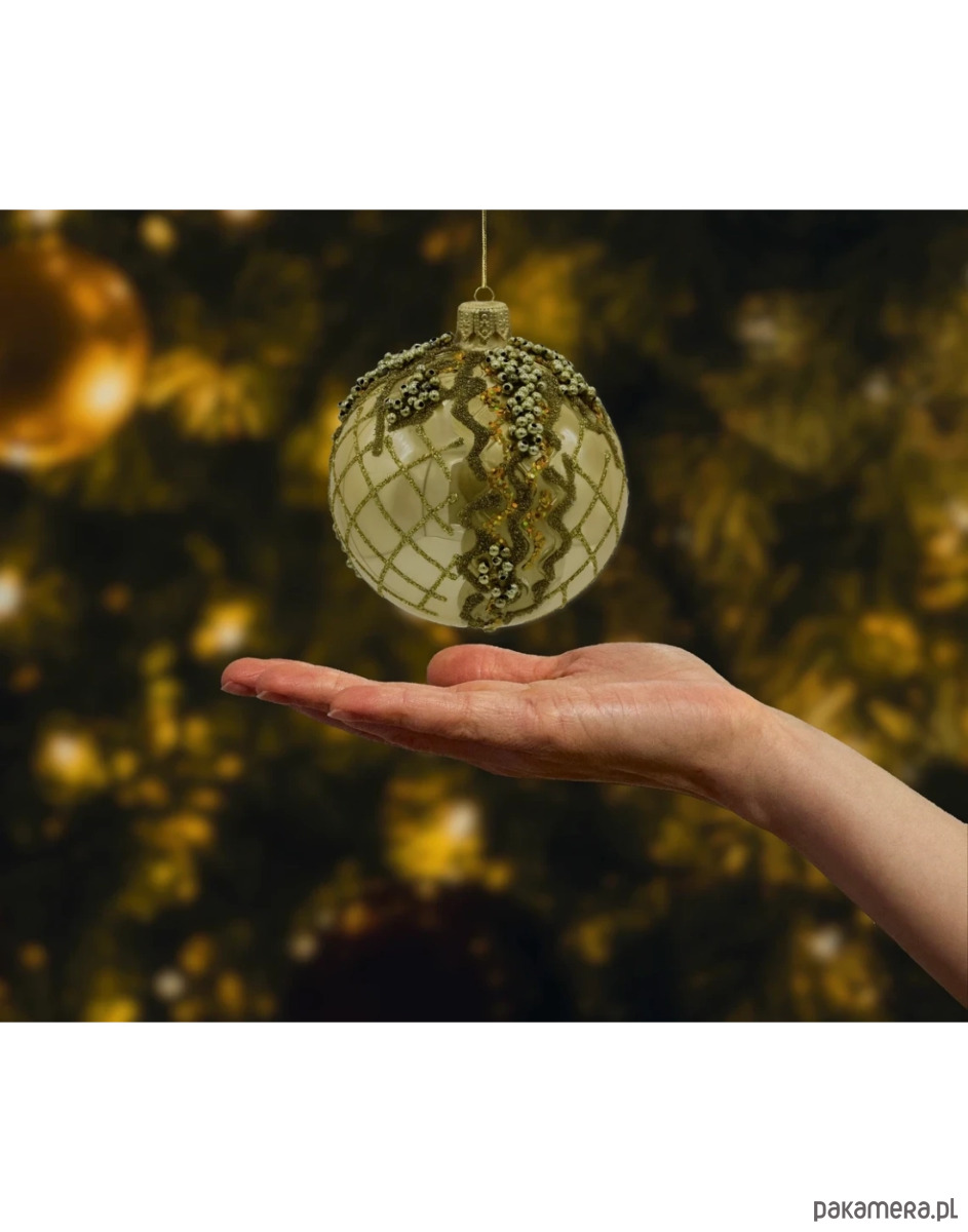 Szklana bombka choinkowa w złotym kolorze z misternymi zdobieniami to elegancka ozdoba, która doda Twojej choince wyrafinowanego blasku i wyjątkowego charakteru. Ręczne zdobienia, perłowe akcenty oraz subtelne brokatowe elementy sprawiają, że jest to idealny wybór na prezent dla miłośników klasycznych, luksusowych dekoracji świątecznych.