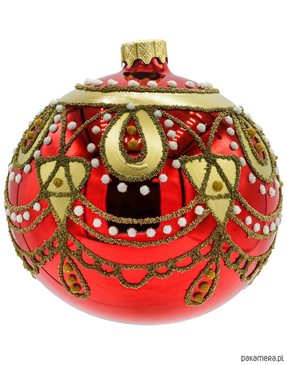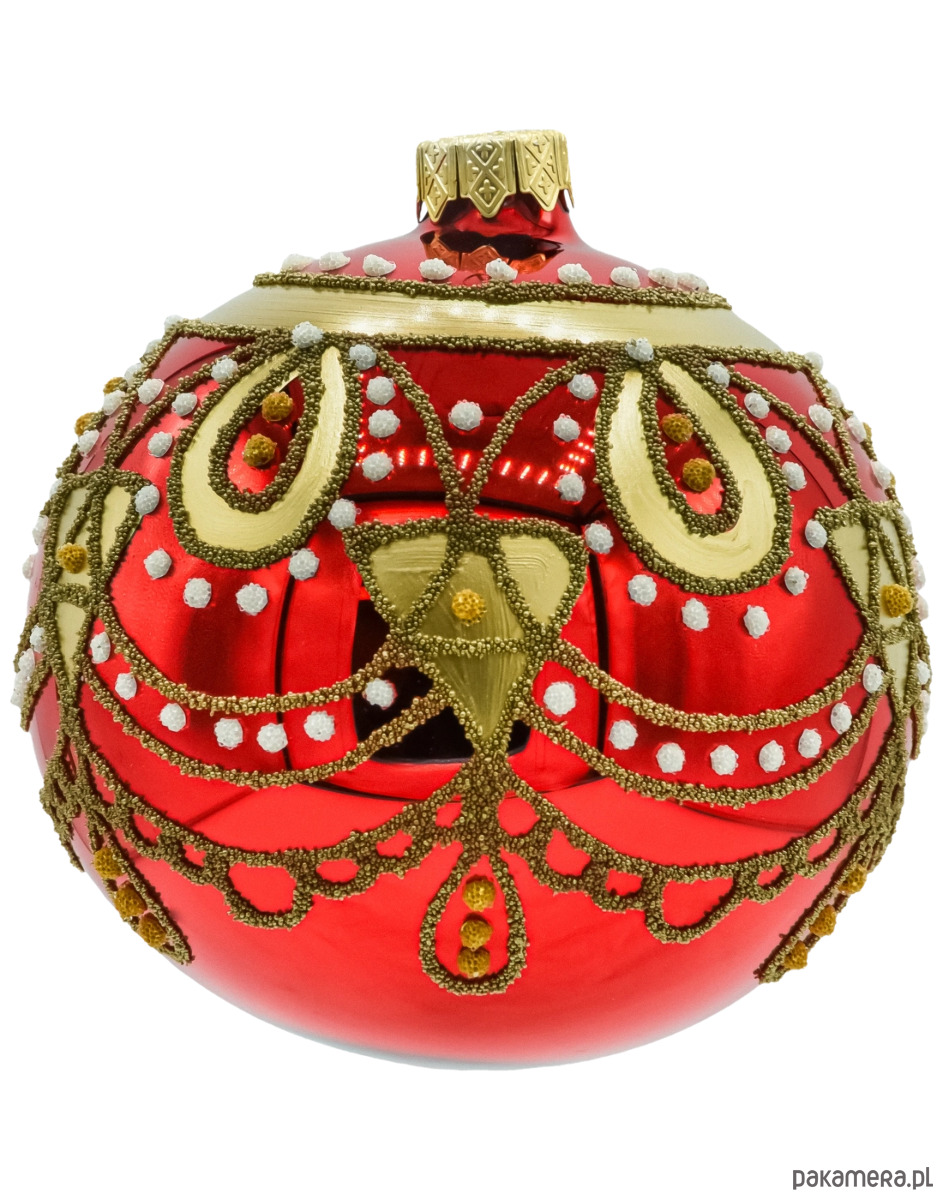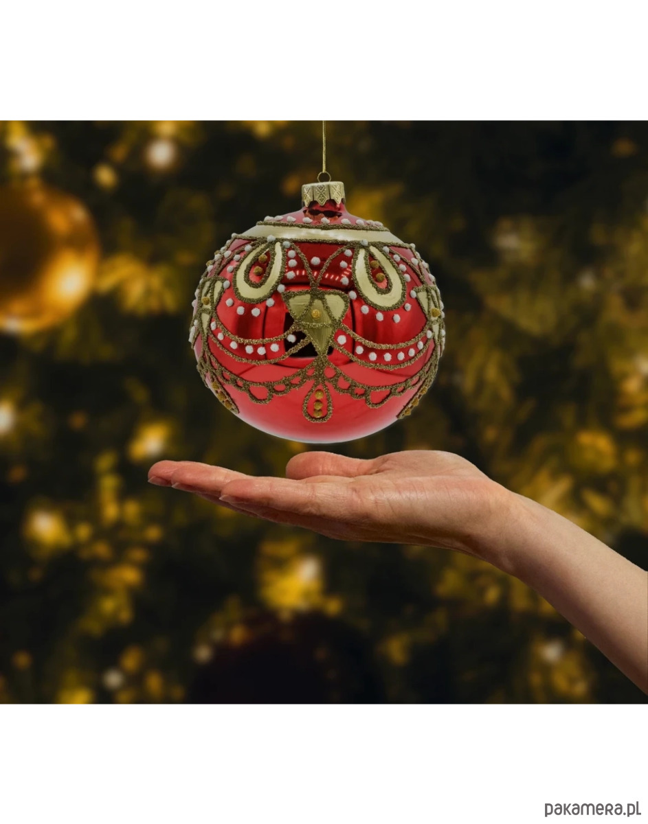 Rozświetl choinkę klasyką w wydaniu glamour. Ten komplet trzech szklanych bombek choinkowych 10 cm powstał z myślą o eleganckich, czerwono-złotych aranżacjach. Błyszcząca, głęboka czerwień stanowi tło dla misternie ręcznie zdobionych wzorów: koronkowych łuków ze złotego brokatu, perełkowych kropek 3D oraz fasetowanych kryształków odbijających światło. Dzięki reliefowym aplikacjom każda kula mieni się i zyskuje wyraźny efekt 3D, a złote koronki i kropki „śniegu” tworzą na powierzchni biżuteryjną siatkę. Złota czapeczka dopełnia całości, podkreślając luksusowy charakter dekoracji.