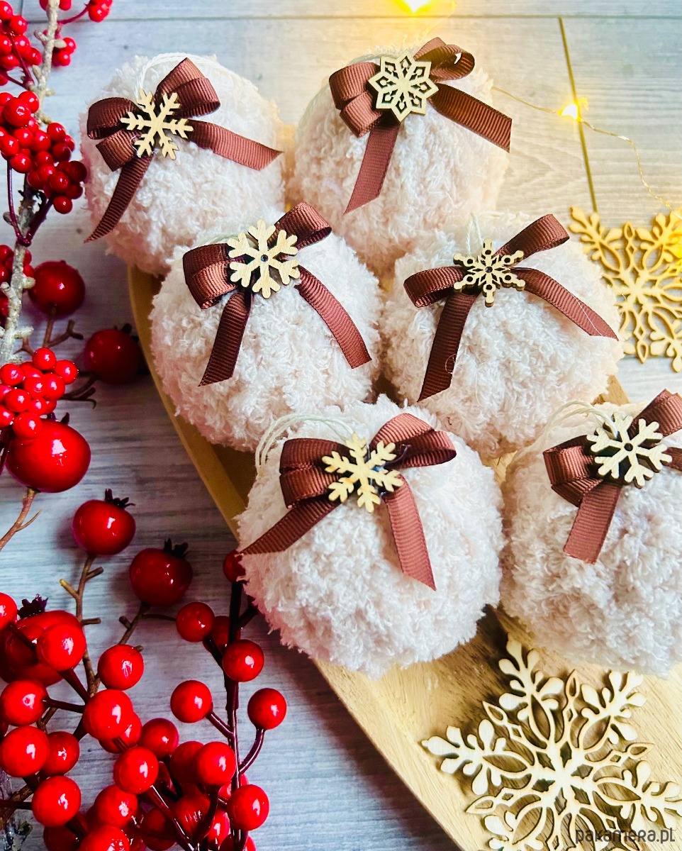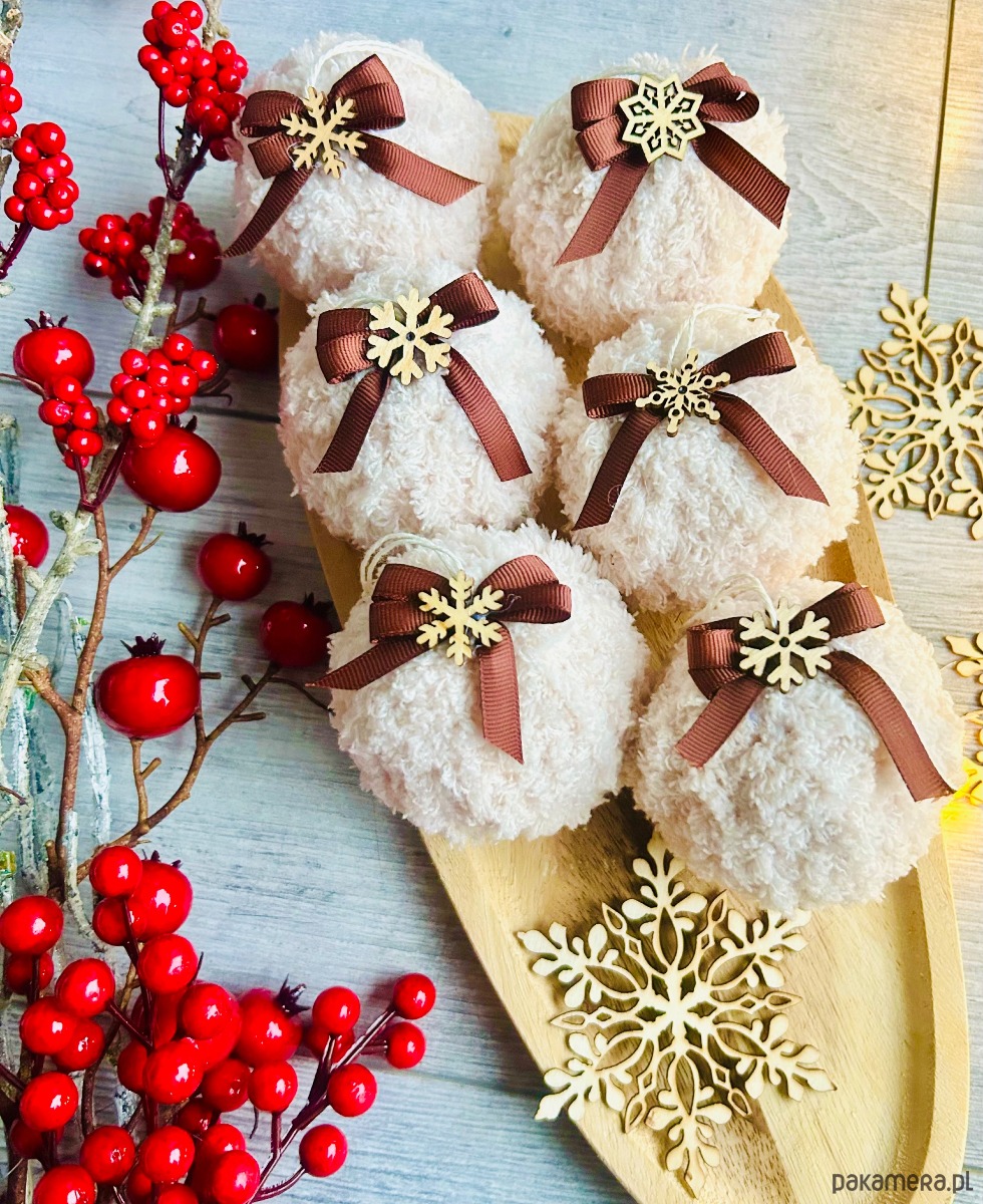Zestaw puchatych bombek w kolorze beżu z czekoladową kokardką i dekoracyjną śnieżynką