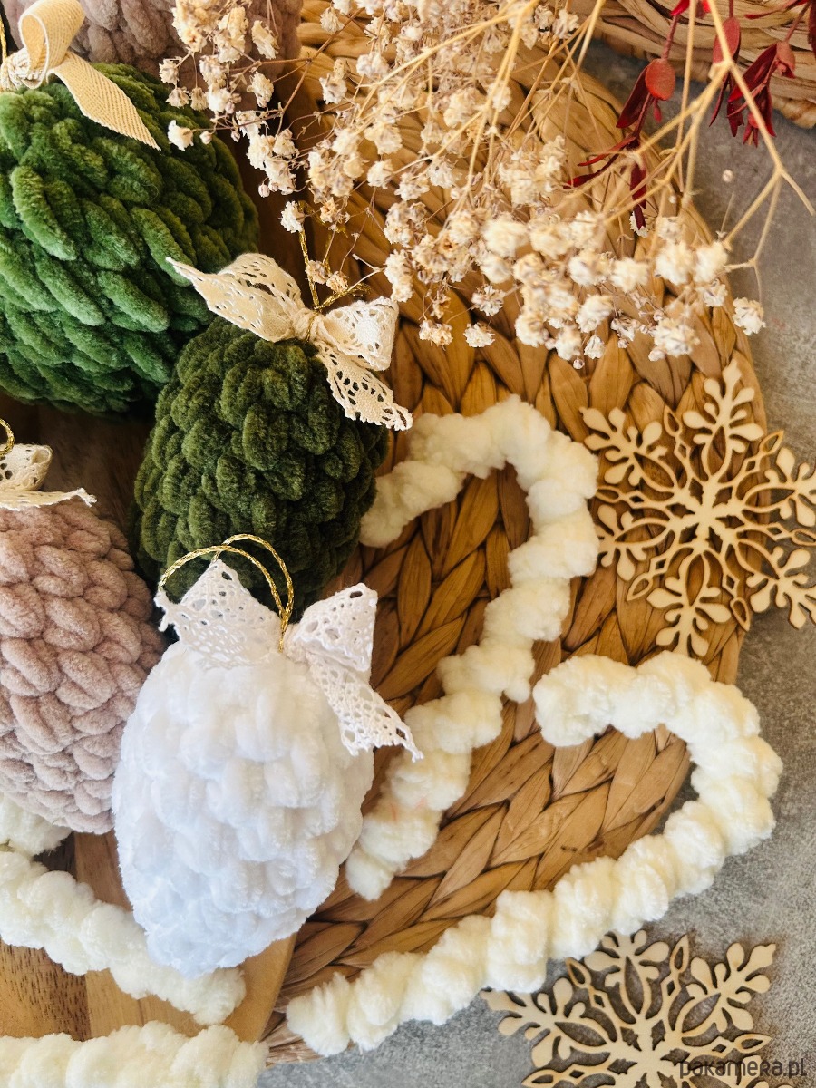 Bombki i szyszki wykonane na szydełku w odcieniach bieli, ecru, beżu, brązu i zieleni