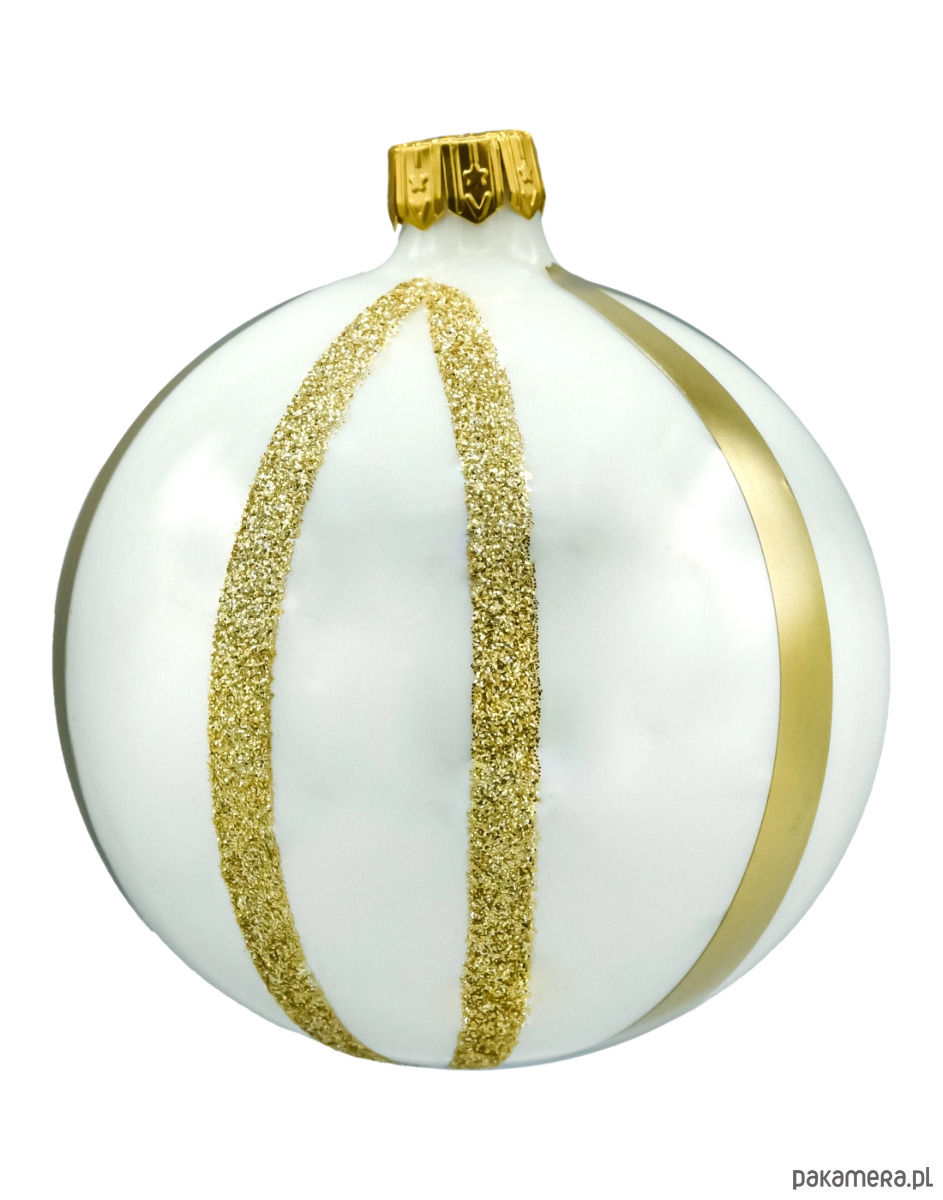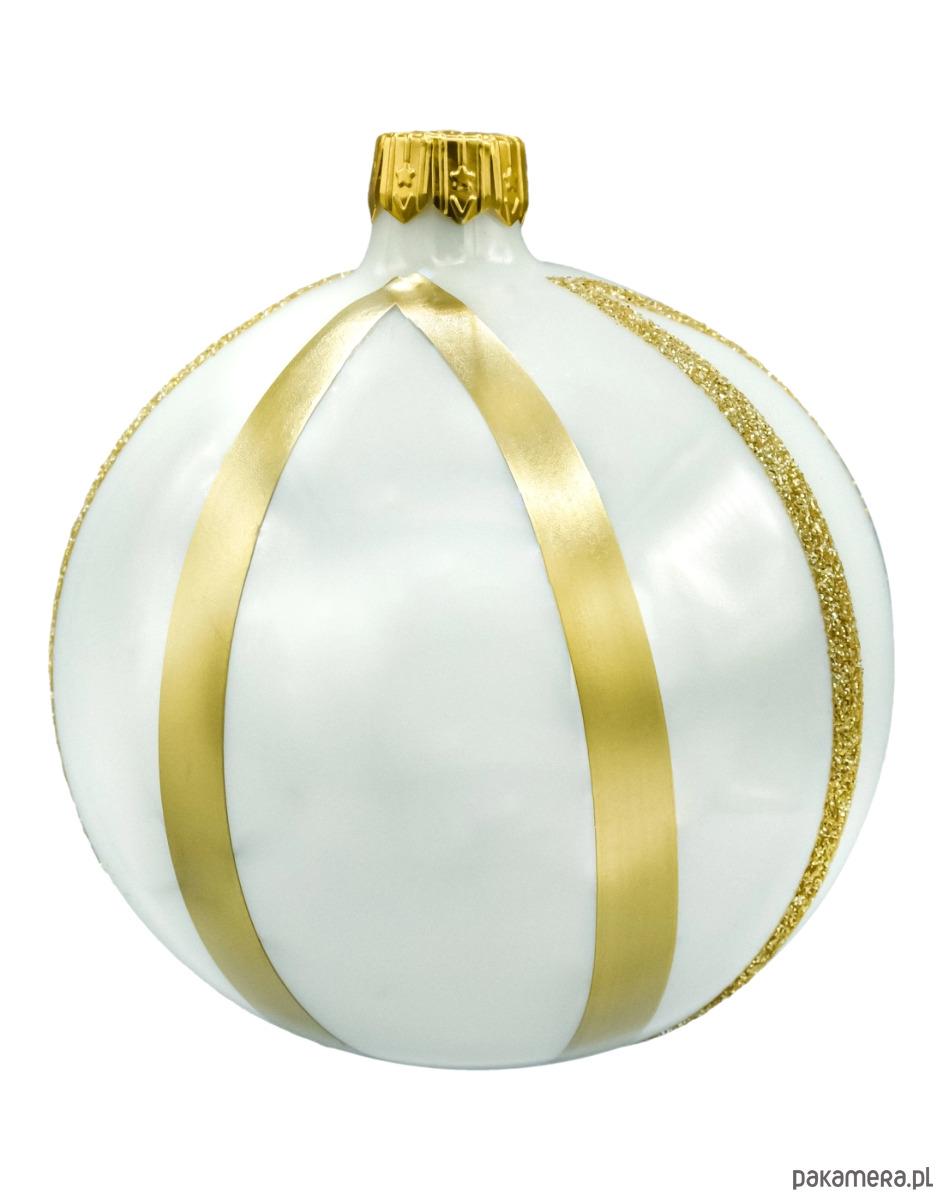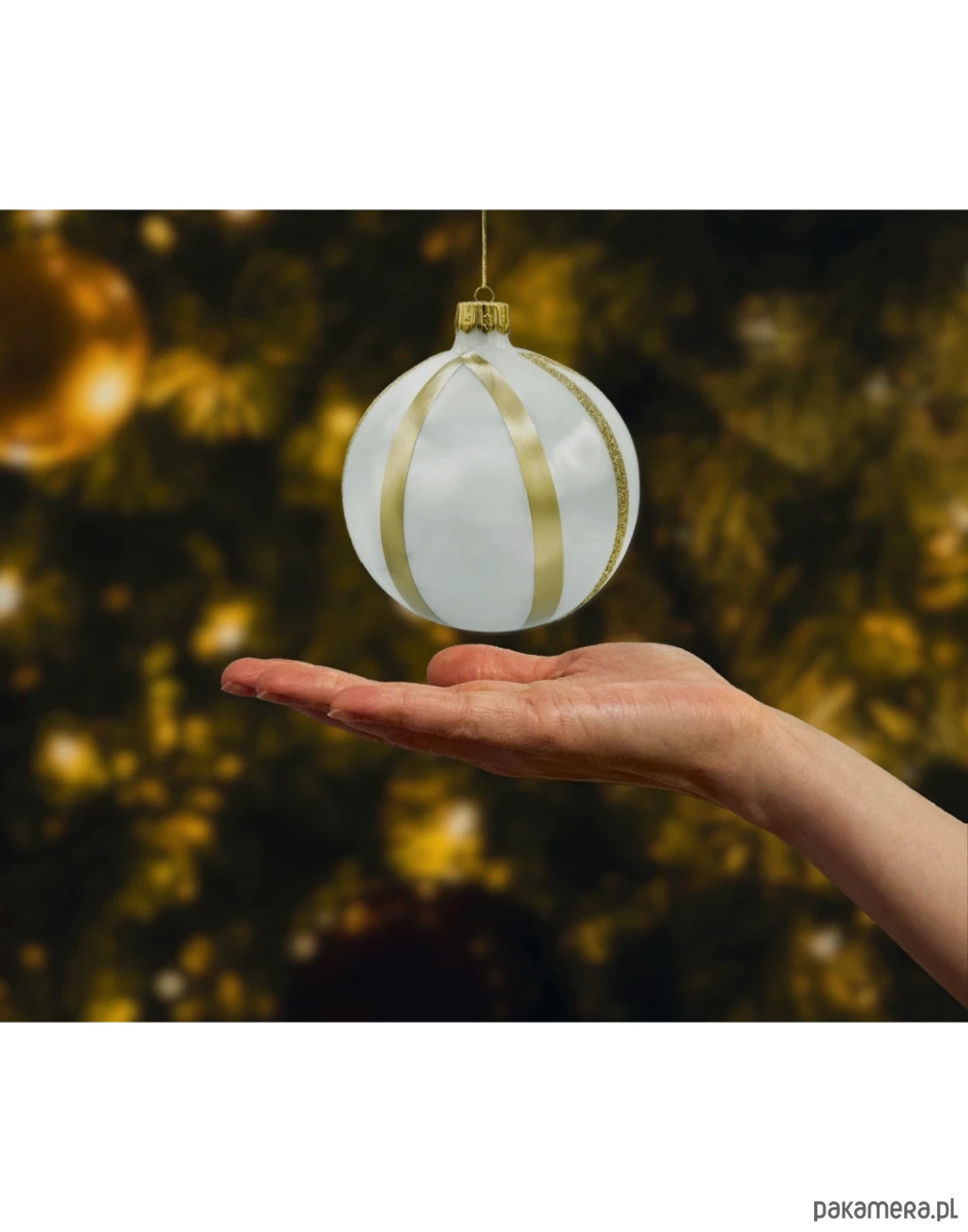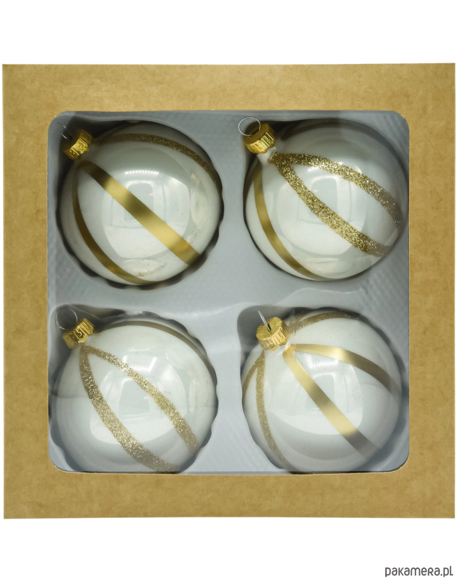 Elegancki komplet 4 szklanych bombek choinkowych w ponadczasowym duecie bieli i złota. Każda bombka została ręcznie wydmuchana z cienkiego szkła i ręcznie malowana w polskiej manufakturze, dzięki czemu zachwyca lekkością, szlachetnym połyskiem oraz subtelnymi różnicami – prawdziwy znak rzemiosła. Białe, satynowo-perłowe tło zestawiono tu z złotymi pasami: gładkimi metalicznymi oraz brokatowymi o ziarnistej strukturze, które pięknie łapią światło lampek. Złota koronka (kapturek) dopasowana kolorystycznie dodaje całości biżuteryjnego wykończenia.