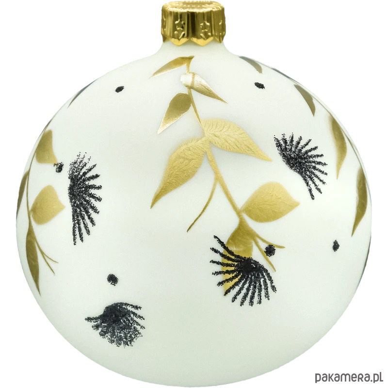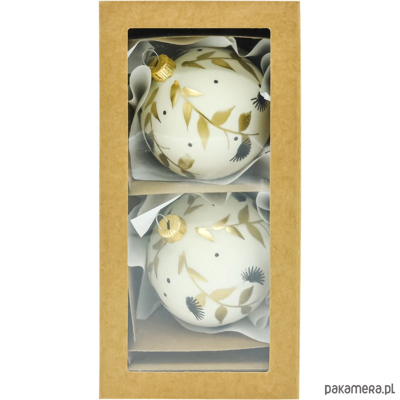 Elegancki zestaw 2 szklanych bombek choinkowych 8 cm w nowoczesnej kolorystyce bieli, złota i czerni. Każda bombka ma matowe, mleczne tło, na którym ręcznie namalowano metaliczne, złote liście oraz dodano czarne, brokatowe akcenty przypominające zimowe kwiaty/dmuchawce. Delikatny połysk i kontrastowe detale sprawiają, że ozdoby prezentują się niezwykle szykownie – to idealny wybór do aranżacji w stylu glamour, klasycznym lub nowoczesnym. Komplet jest zapakowany w estetyczne pudełko z okienkiem z kartonu kraft, dzięki czemu doskonale sprawdzi się także w roli gotowego upominku świątecznego.