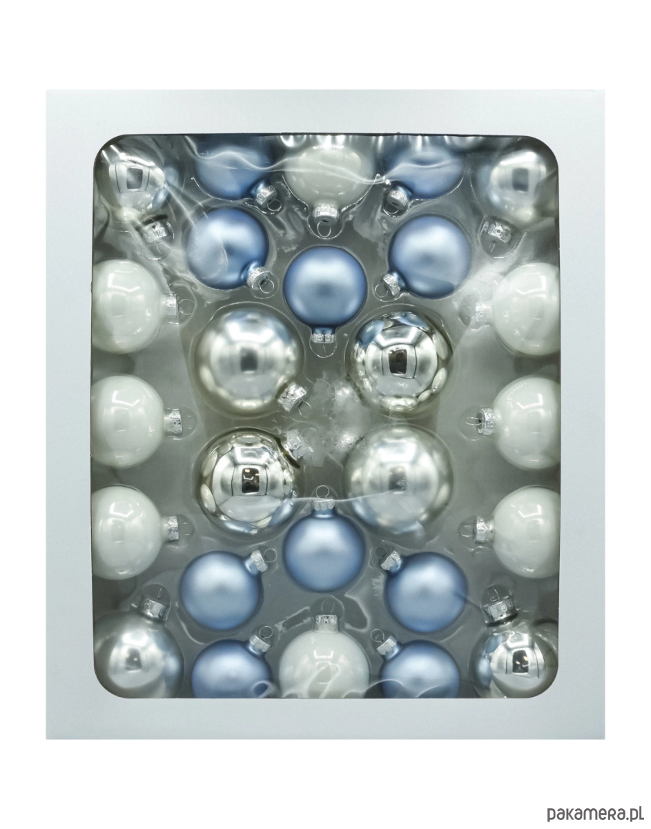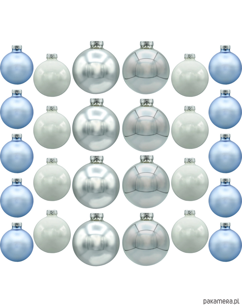 Elegancki, wieloelementowy zestaw bombek choinkowych w odcieniach srebra, perłowej bieli i lodowego błękitu to klasyka, która rozświetla choinkę i nadaje wnętrzu zimowego, szlachetnego charakteru. W komplecie znajdziesz małe, lekkie kulki w trzech wykończeniach – połysk (chrome), mat oraz perła – dzięki czemu dekoracja zyskuje głębię i pięknie odbija światło lampek. Chłodna paleta kolorystyczna harmonizuje z białymi światełkami, naturalną zielenią drzewka oraz nowoczesnymi, skandynawskimi aranżacjami.