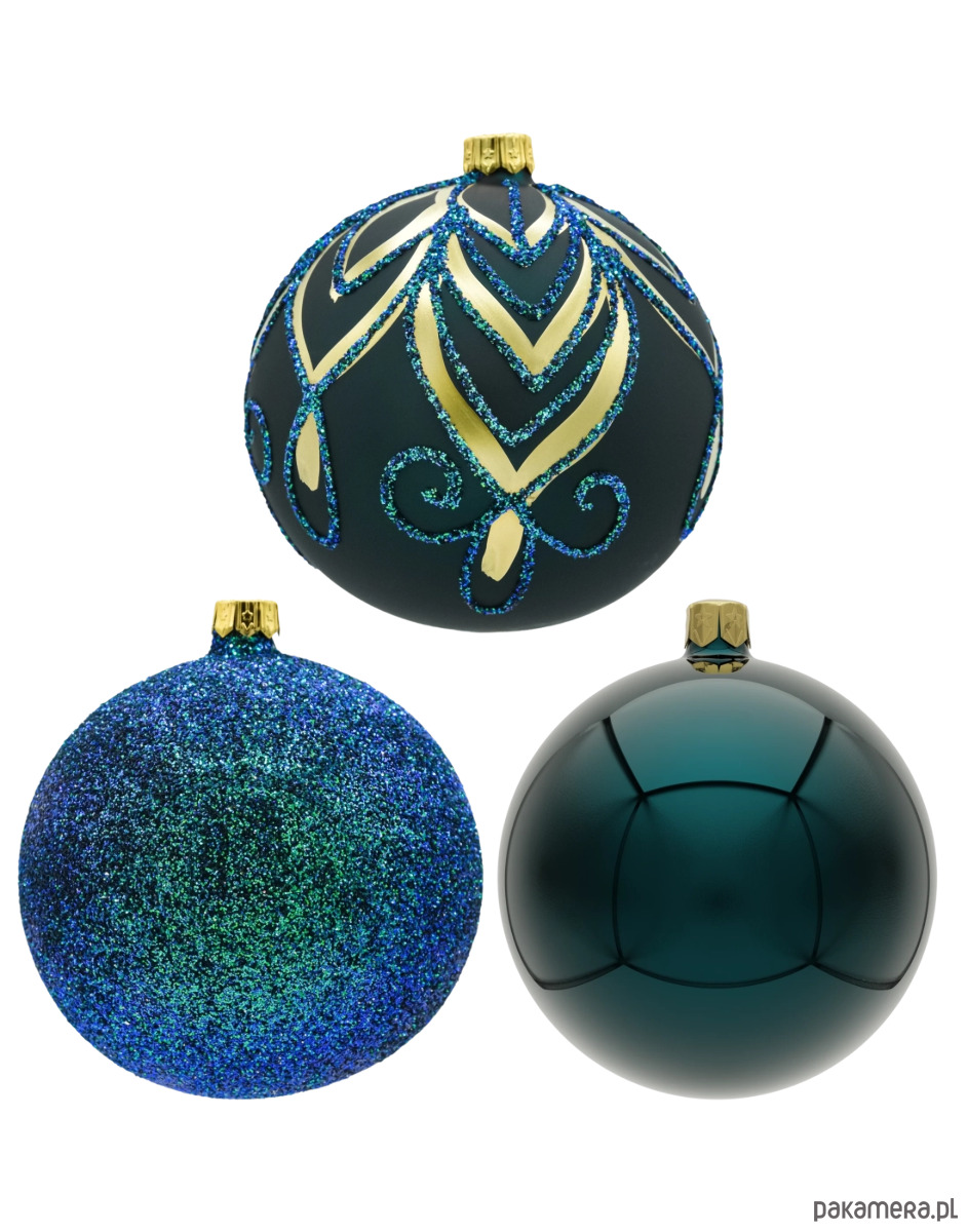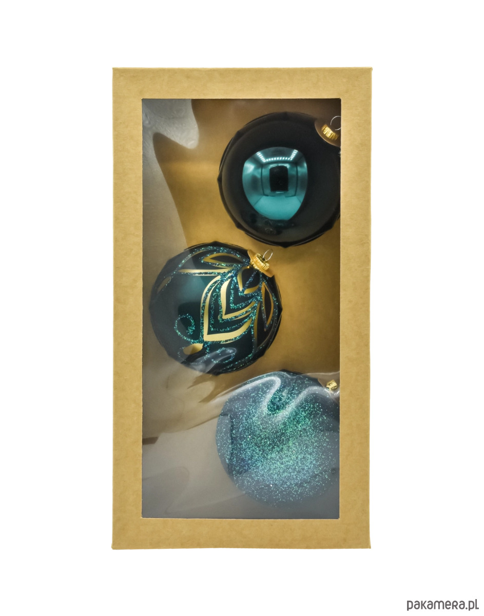 Bombki wykonano ze szkła dmuchanego i ręcznie zdobiono w polskiej pracowni, dlatego każda sztuka jest unikatem. Zestaw pakowany jest w karton z okienkiem, który zabezpiecza szkło i od razu nadaje się na prezent świąteczny. Kolorystyka teal + złoto pięknie komponuje się z zielenią drzewka, świetnie pasuje do stylu glamour, modern i art déco.