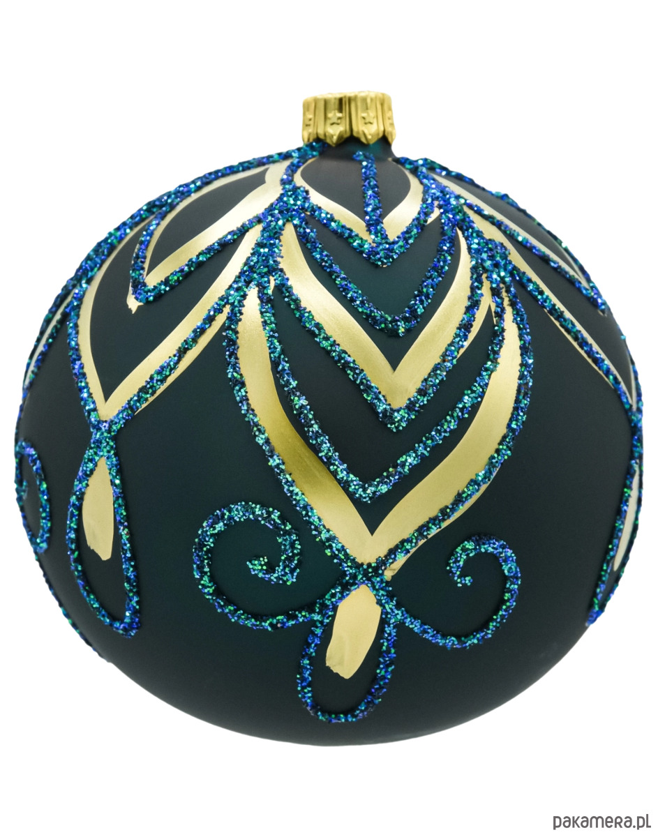 kula matowa z ornamentem art déco – złote liście obrysowane mieniącym się niebiesko-zielonym brokatem,