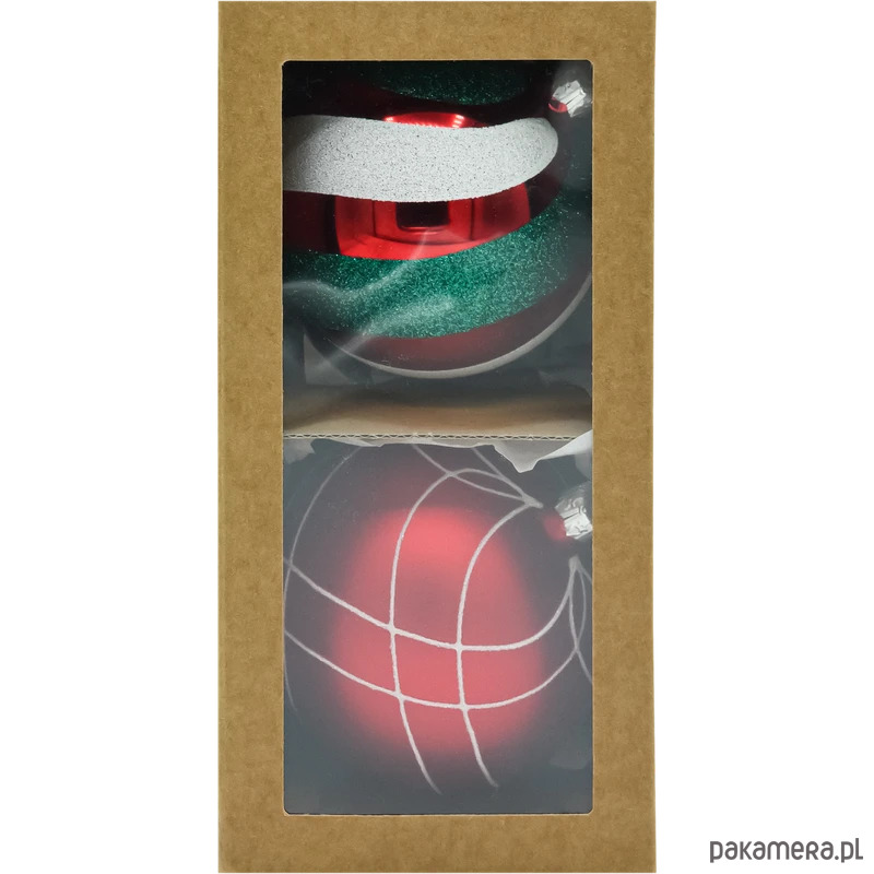 • Wykończenie: 1× połysk z pasami zielonego brokatu i białej „śnieżnej” taśmy, 1× matowa czerwień z białą kratką