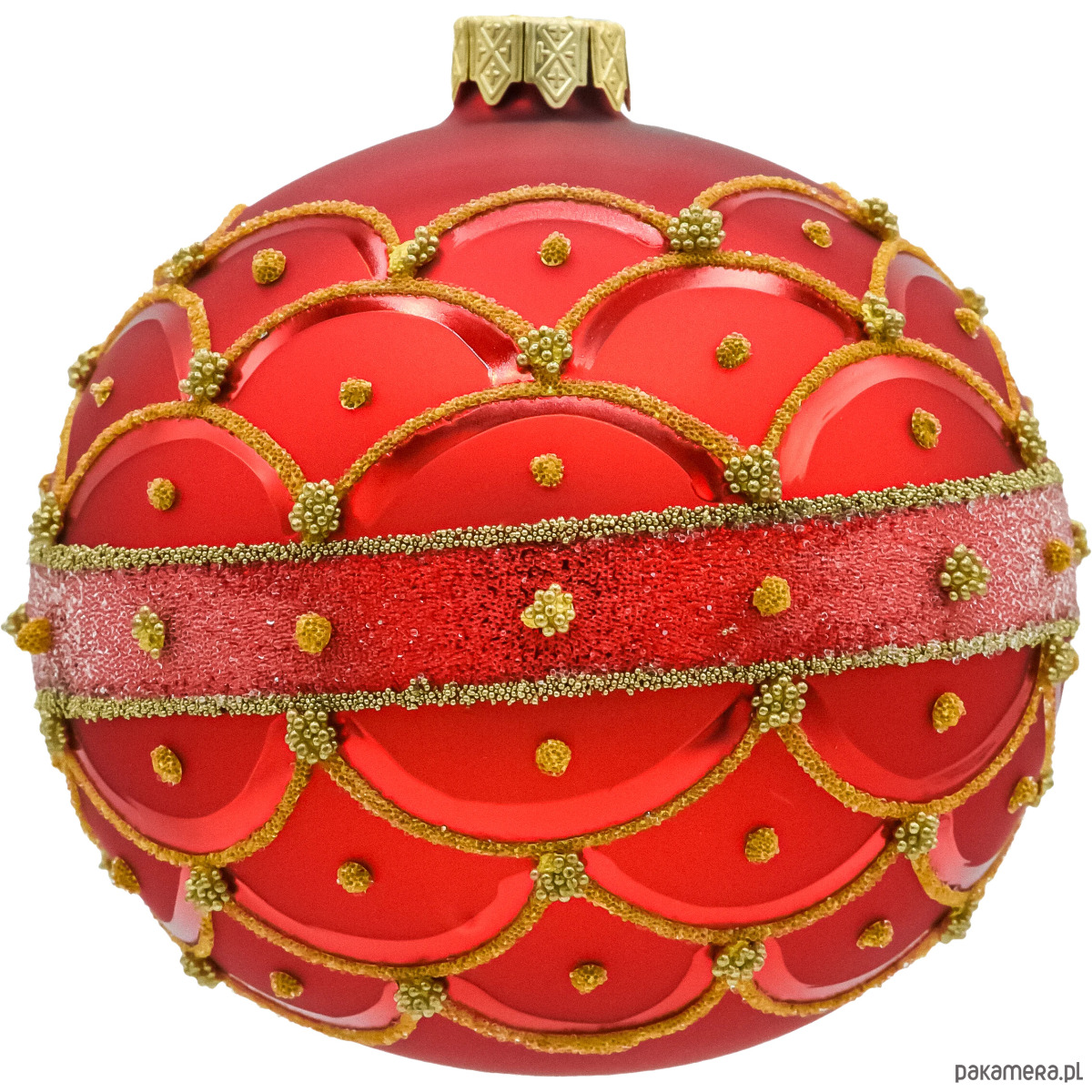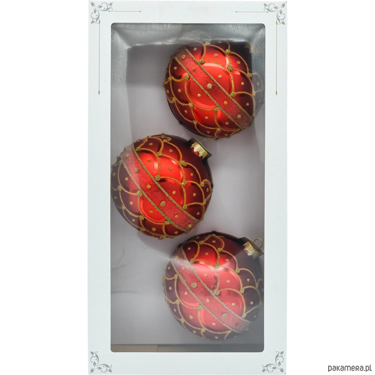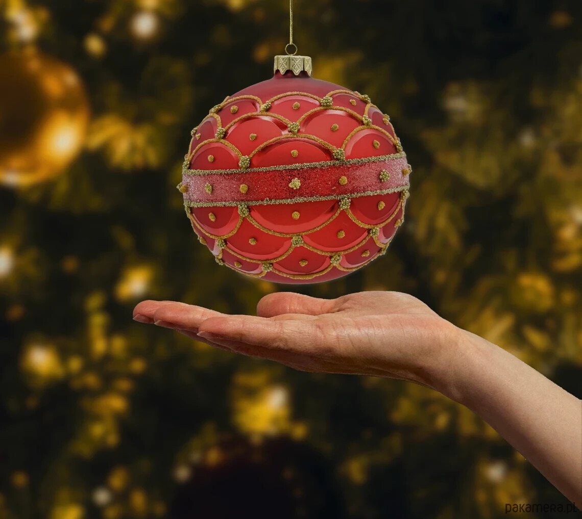 Wytworne, czerwone bombki choinkowe o średnicy 10 cm, ręcznie zdobione misterną, złotą „koronką” z mikrokuleczek i brokatu. Przez środek każdej bombki biegnie szeroki, dekoracyjny pas z drobnych iskier – nadaje głębi, a choinkowe światła pięknie się w nim odbijają. To klasyka Bożego Narodzenia w luksusowym wydaniu: intensywna czerwień, eleganckie złoto, solidne szkło i perfekcyjna prezencja na drzewku, wieńcu czy w stroiku.