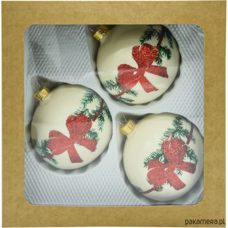 Wprowadź do domu klasyczne, świąteczne piękno. Ten komplet 3 szklanych bombek o średnicy 8 cm łączy elegancką, kremową bazę z ręcznie układaną dekoracją: gałązki świerku w soczystej zieleni i efektowne czerwone kokardy z połyskującym brokatem. To ponadczasowy motyw, który pięknie rozświetla choinkę i współgra zarówno z tradycyjnymi, jak i nowoczesnymi aranżacjami.
