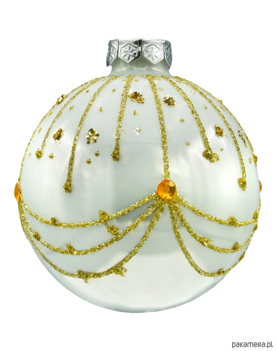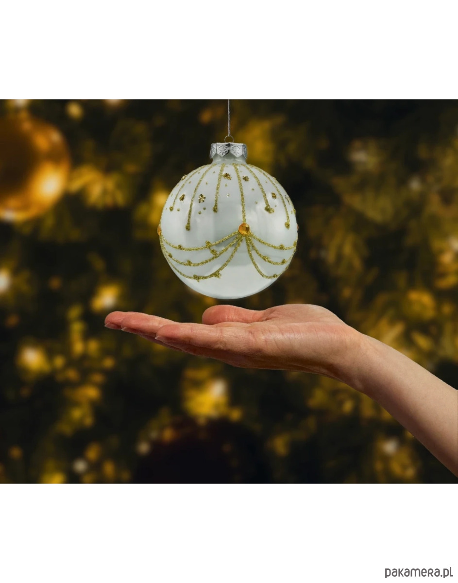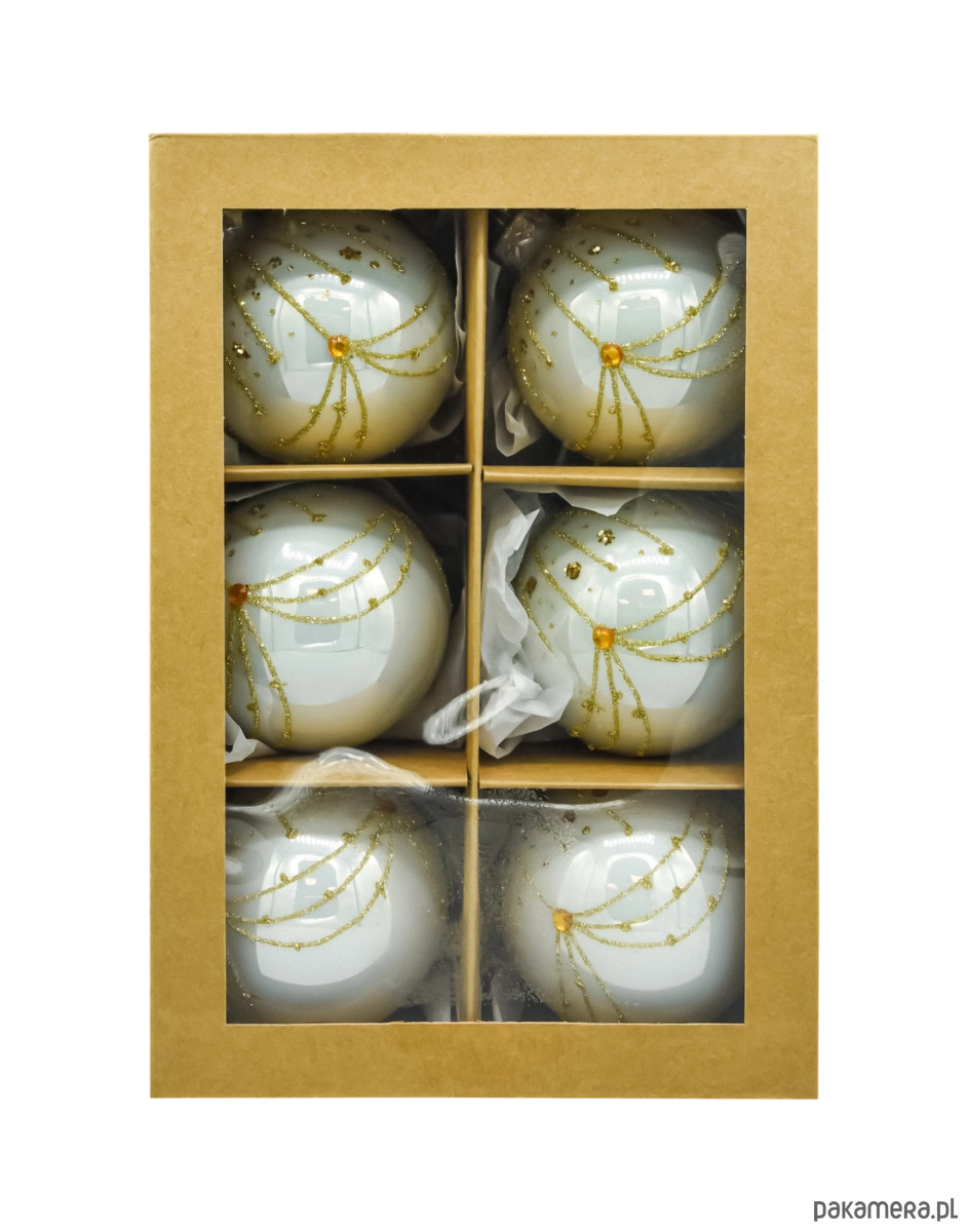 Elegancki komplet sześciu szklanych bombek choinkowych o średnicy 8 cm. Każda kula została ręcznie dekorowana w odcieniu perłowej bieli i ozdobiona kaskadami złotego brokatu oraz drobnymi kryształkami w kolorze bursztynu. Delikatne „girlandy” z brokatowych nitek pięknie łapią światło lampek, a fasetowane kamienie dodają wysublimowanego blasku, który kojarzy się ze stylem glamour. Bombki mają klasyczny kształt kuli, srebrną koronę z oczkiem do zawieszenia oraz równy szlif, dzięki czemu harmonijnie układają się na gałęziach. Zestaw zapakowany jest w kartonowe pudełko z okienkiem i przegródkami, idealne do wręczenia w prezencie i bezpiecznego przechowywania po sezonie.