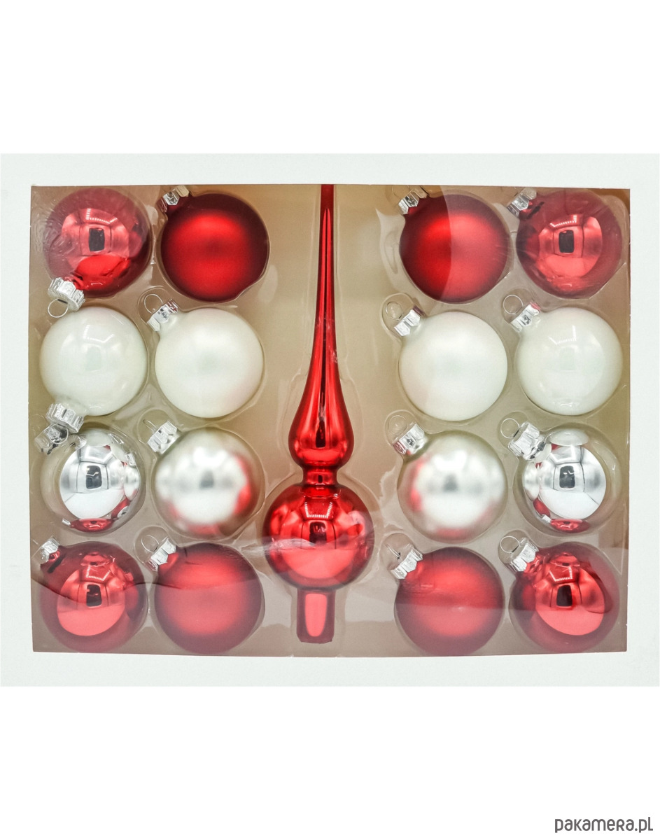 • Komplet 17 elementów: 16 bombek kulistych (mix koloru czerwonego, białego i srebrnego; mat/połysk) + 1 czubek w czerwieni.
