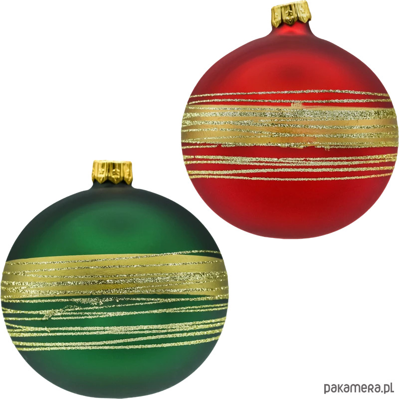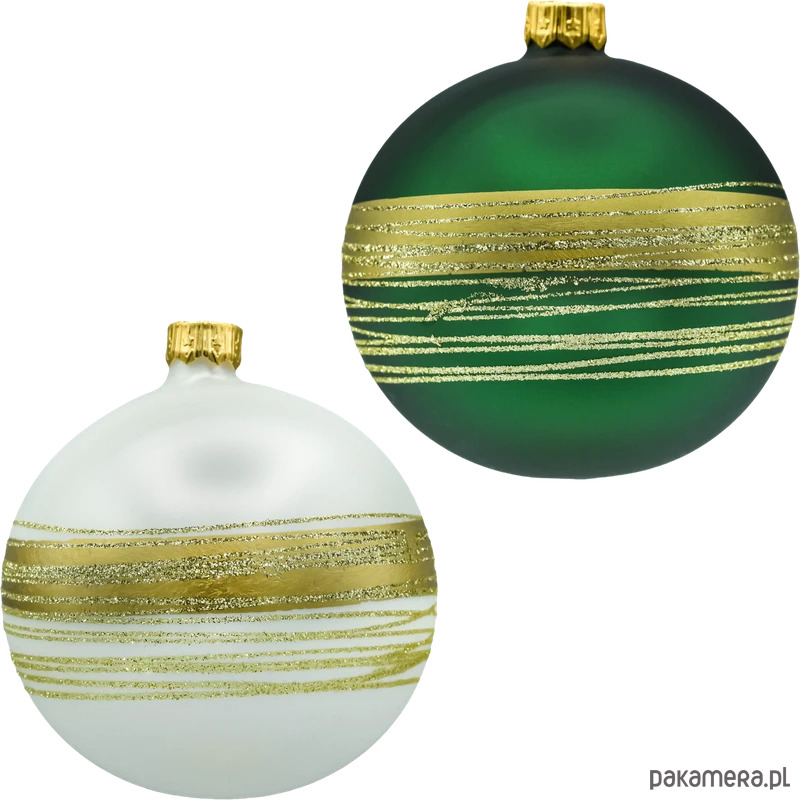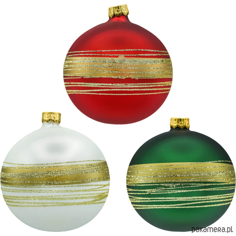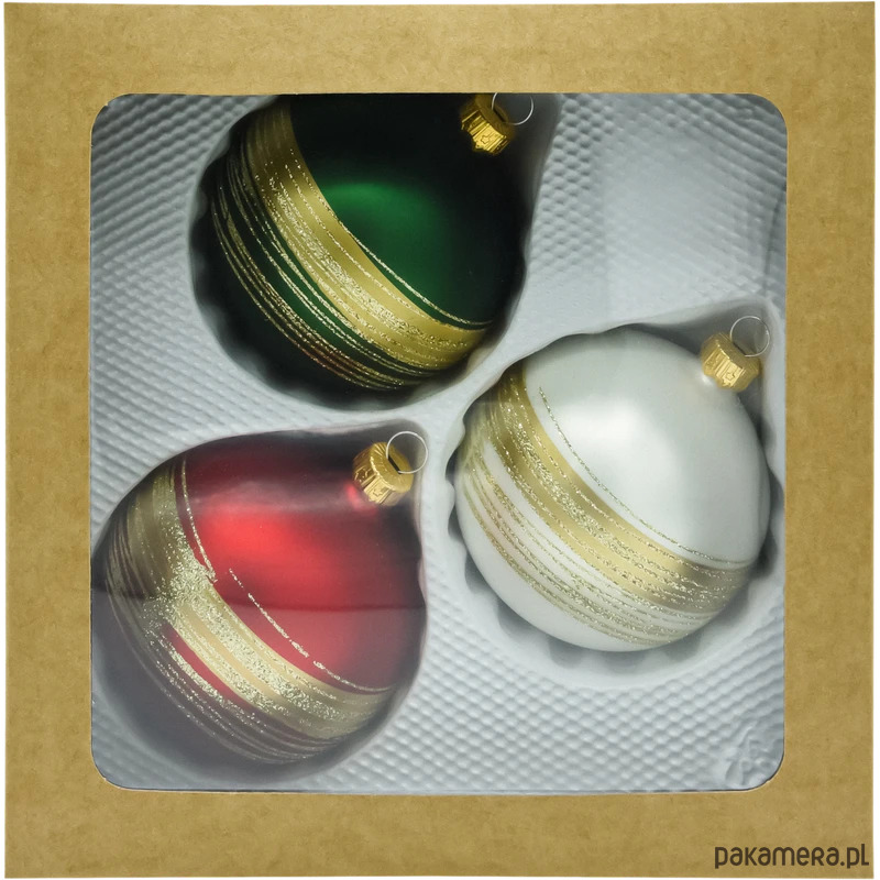 Klasyczne, a zarazem efektowne bombki choinkowe z polskiego szkła dmuchanego. W zestawie znajdują się 3 sztuki o średnicy 8 cm – matowa czerwień, głęboka zieleń i elegancka biel. Każda kula została ręcznie wykończona złotymi pasami oraz drobnym brokatem, który pięknie odbija światło lampek. Harmonijna kolorystyka czerwieni, zieleni i złota tworzy ponadczasowy, świąteczny duet, dzięki któremu zestaw bez trudu dopasujesz do większości aranżacji – od tradycyjnej choinki w salonie po styl glamour w hotelowym lobby.