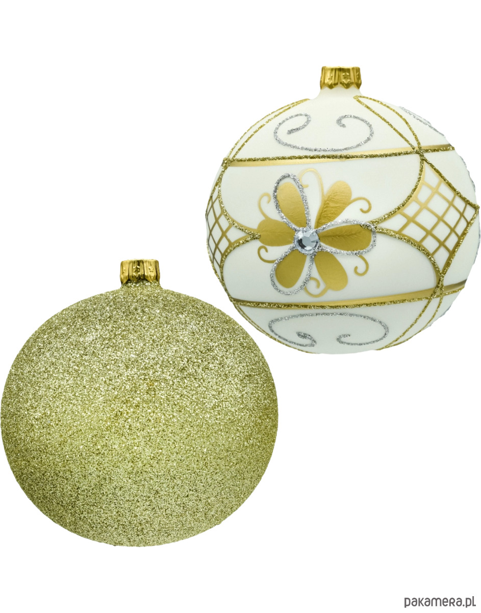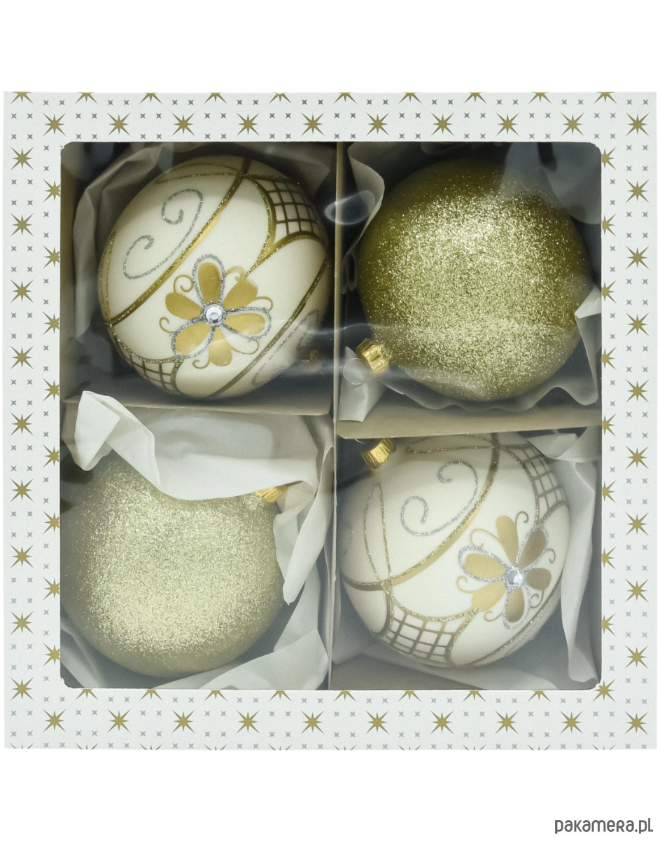 • Wykończenie: dwie bombki w całości posypane złotym brokatem (efekt „glitter total”), dwie w matowym ecru z finezyjną siatką i kwiatem.