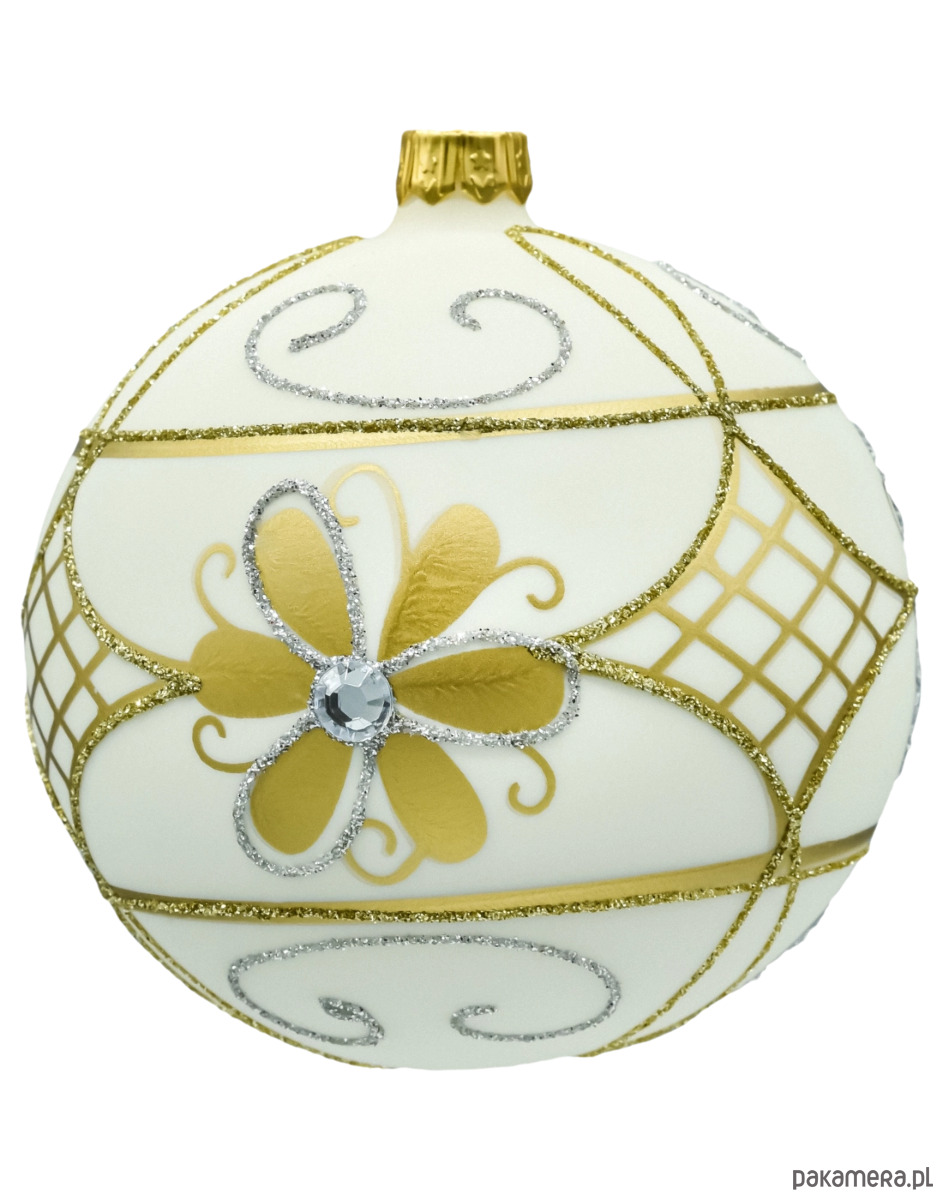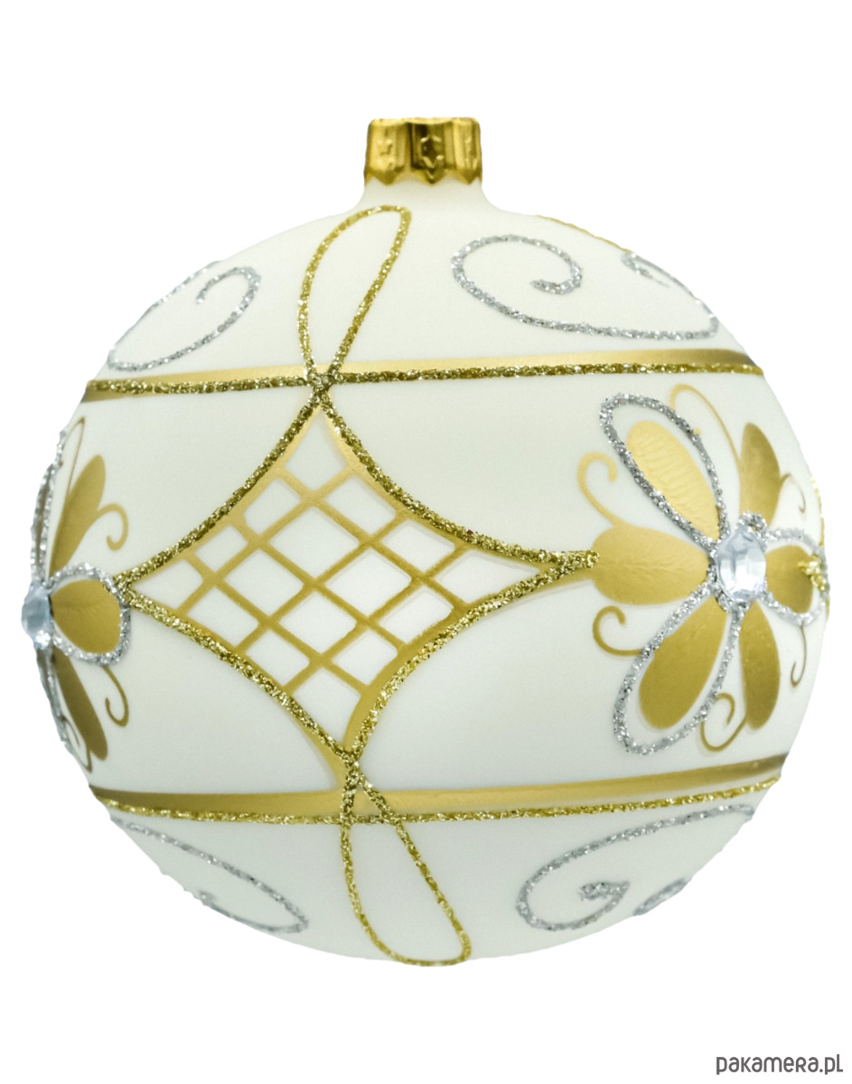 • Zdobienie: ręcznie malowany wzór kwiatowo-geometryczny w złocie i srebrze, brokat o drobnym uziarnieniu; centralnie osadzony kryształek (na bombkach dekorowanych).