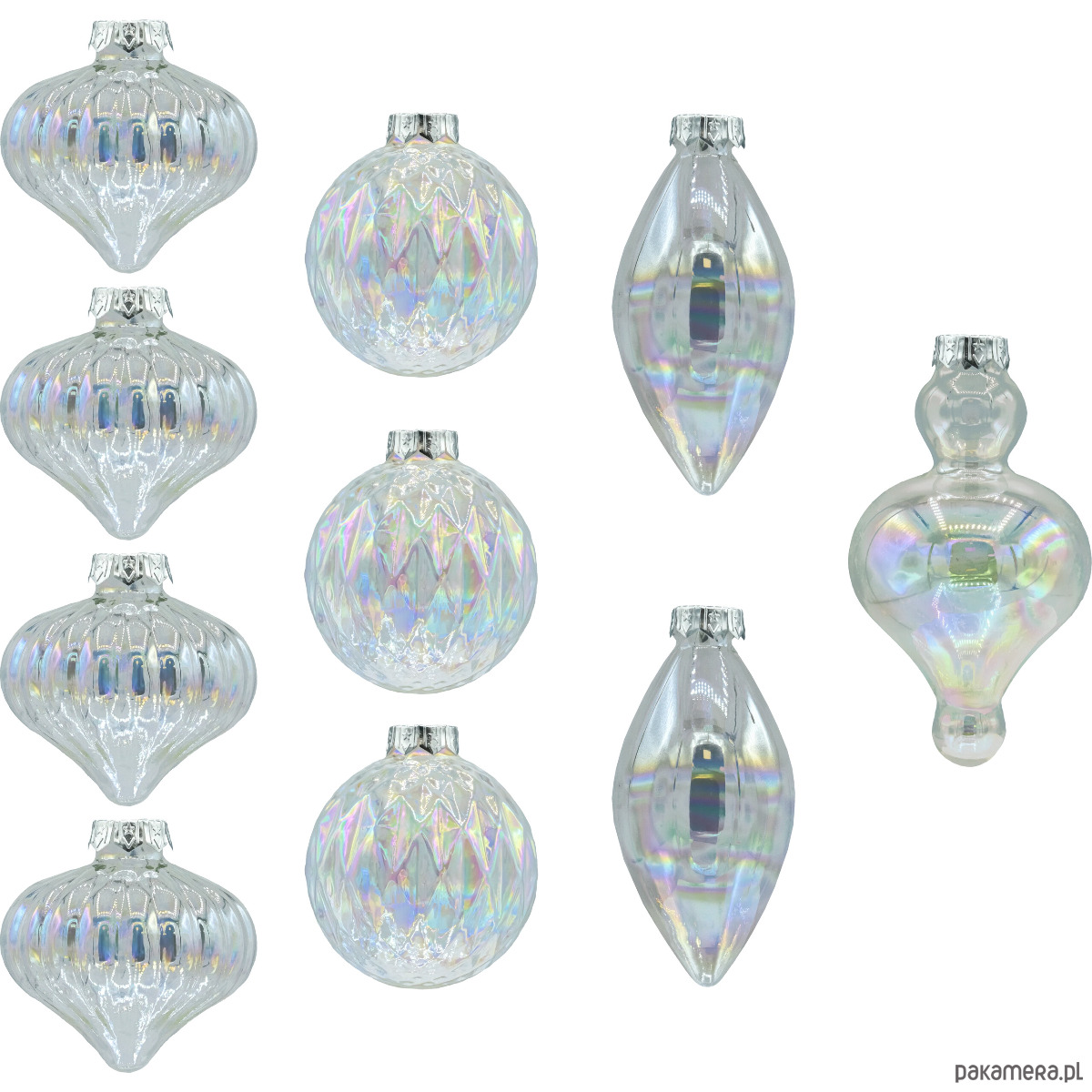 Ten komplet nowoczesnych ozdób łączy lekkość dmuchanego szkła z zachwycającą, opalizującą poświatą. Przezroczyste bombki o różnych kształtach (kule, „łezki”, cebulki i diamenty) pokryto delikatną warstwą iryzacji, dzięki czemu odbijają światło choinkowych lampek tęczowym blaskiem – jak kryształki lodu. Eleganckie, a zarazem minimalistyczne, pasują do stylu glamour, modern, scandi i klasycznego. To gotowy „starter” do zbudowania świetlistej, lekkiej aranżacji świątecznej.