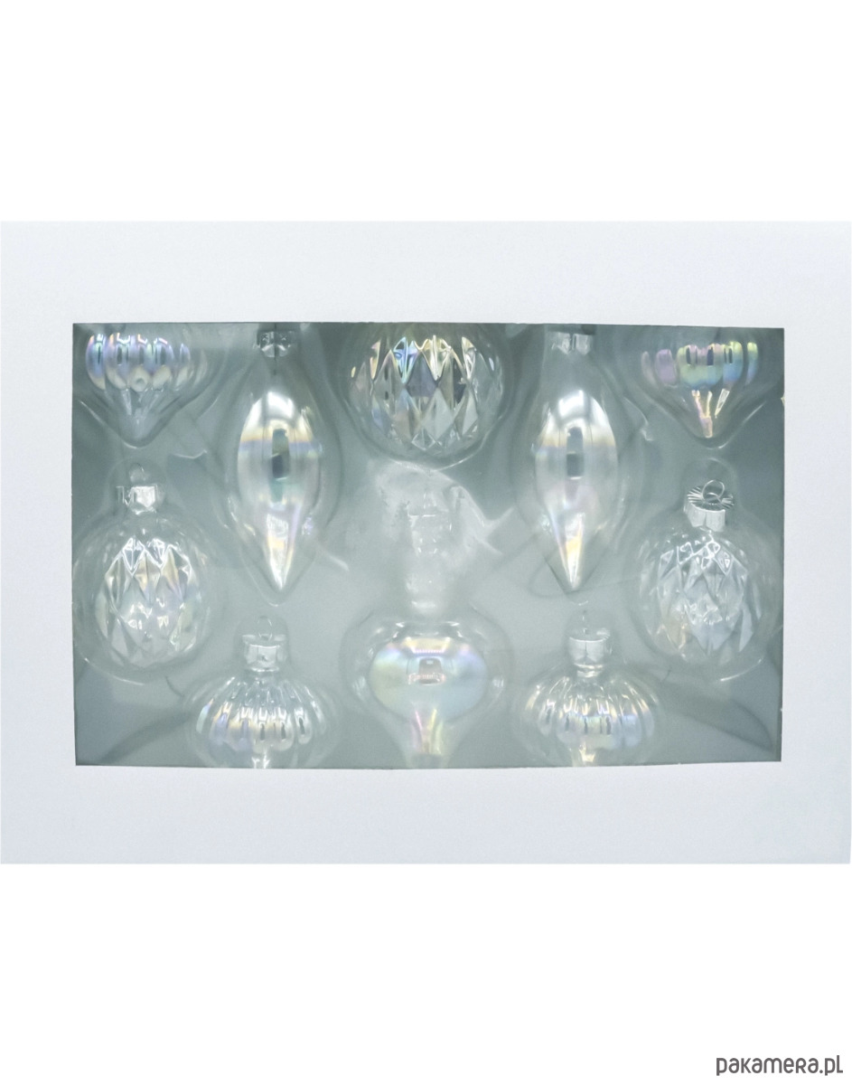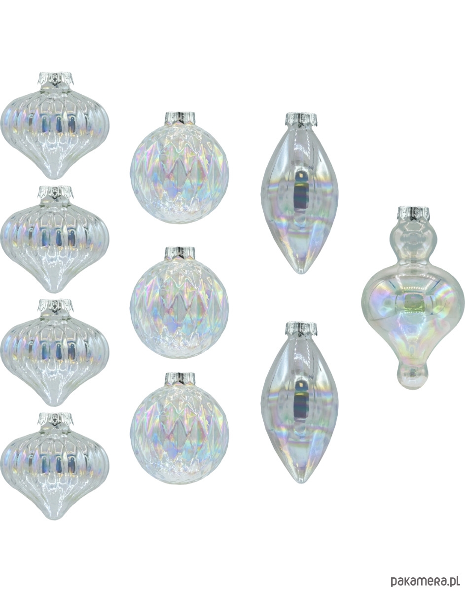 Ten komplet nowoczesnych ozdób łączy lekkość dmuchanego szkła z zachwycającą, opalizującą poświatą. Przezroczyste bombki o różnych kształtach (kule, „łezki”, cebulki i diamenty) pokryto delikatną warstwą iryzacji, dzięki czemu odbijają światło choinkowych lampek tęczowym blaskiem – jak kryształki lodu. Eleganckie, a zarazem minimalistyczne, pasują do stylu glamour, modern, scandi i klasycznego. To gotowy „starter” do zbudowania świetlistej, lekkiej aranżacji świątecznej.