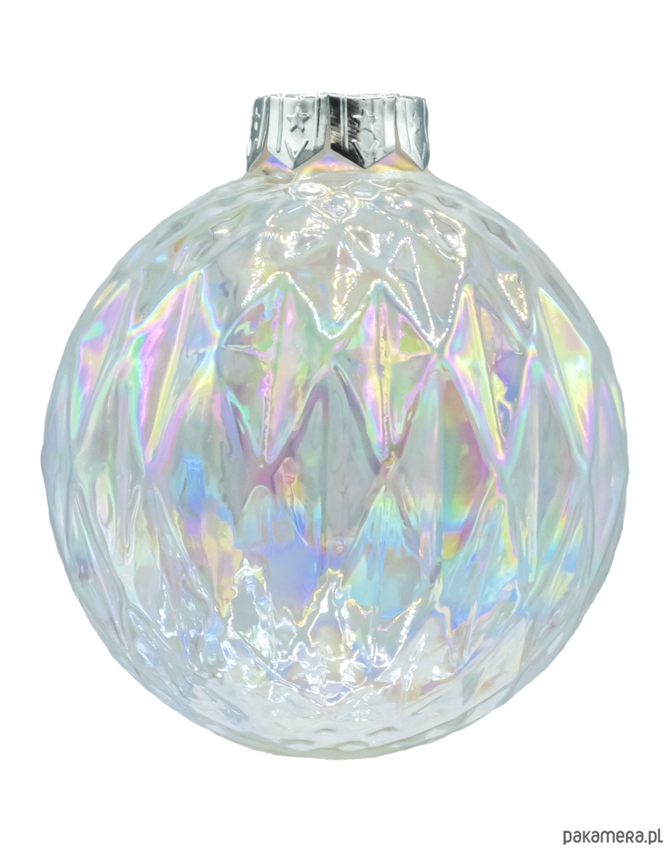 • Kolorystyka: przezroczysta baza ze srebrzystą, perłową aurą; srebrne czapeczki do zawieszania.