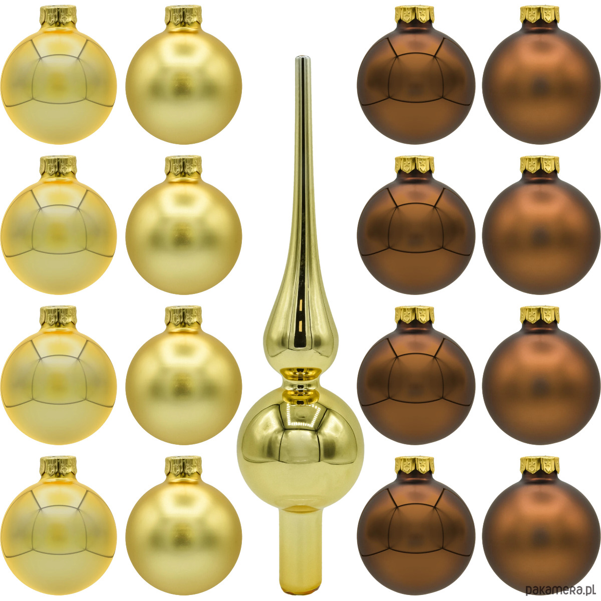Wytworny komplet szklanych ozdób, który w kilka minut stworzy spójną, ciepłą i elegancką aranżację choinki. W pudełku znajdziesz 16 klasycznych bombek w dwóch szlachetnych kolorach – złocie i miedzi – w dwóch wykończeniach: mat i połysk, oraz złoty czub (szpic) do zwieńczenia drzewka. To gotowy zestaw bombek choinkowych dla osób, które cenią spójność kolorystyczną i „hotelowy” porządek na choince bez długiego dobierania elementów.