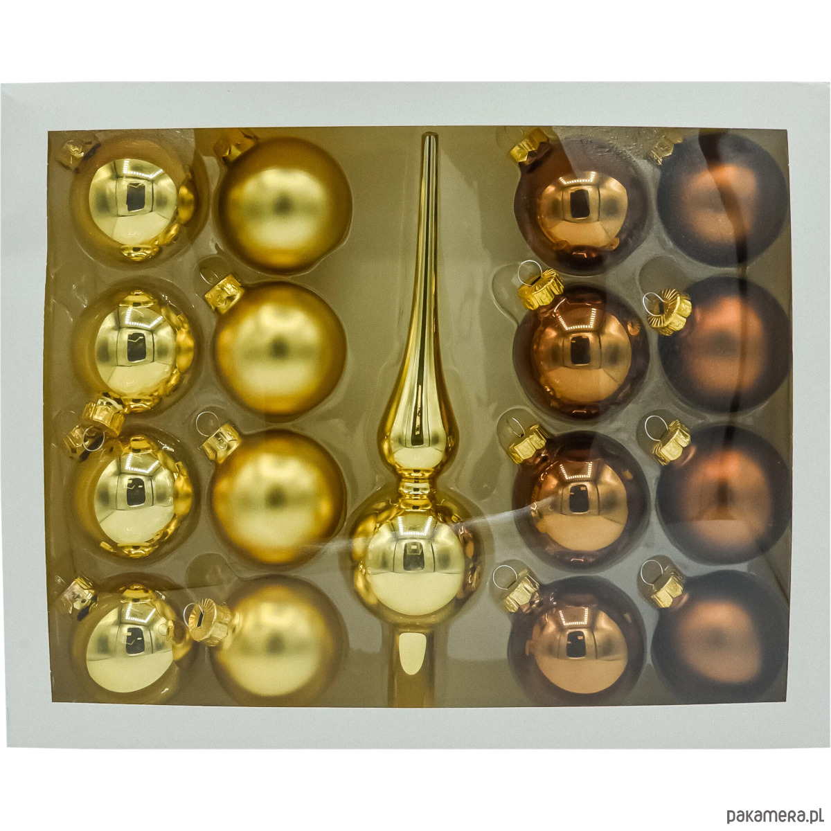 • 16 bombek szklanych (8 w kolorze złotym – 4 połysk, 4 mat; 8 w kolorze miedzianym – 4 połysk, 4 mat).